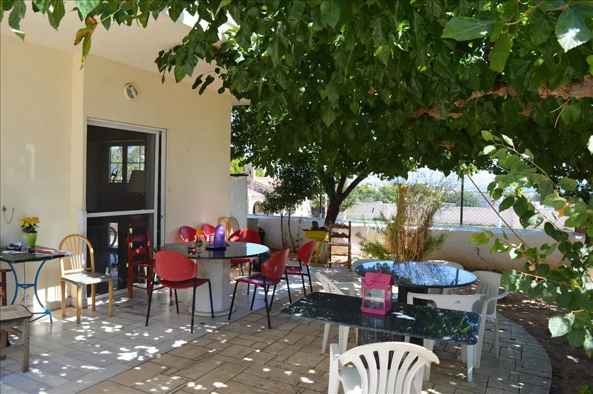 This property boasts a view of the city, the sea, and the mountains from its windows, enhancing the living experience. The house includes several features such as solar panels for water heating, a fireplace for cooling evenings, and a designated barbecue area for outdoor cooking.