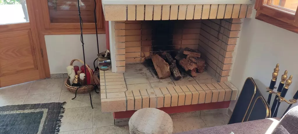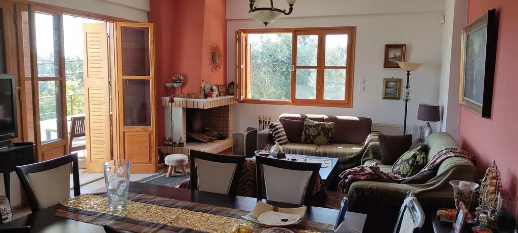 This property presents views of both the sea and the mountains, visible from numerous windows. For temperature management, the house is equipped with a fireplace, air conditioning, and heating system.