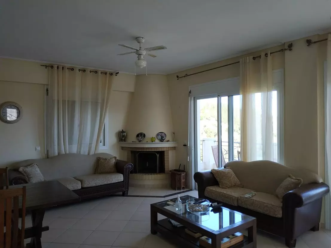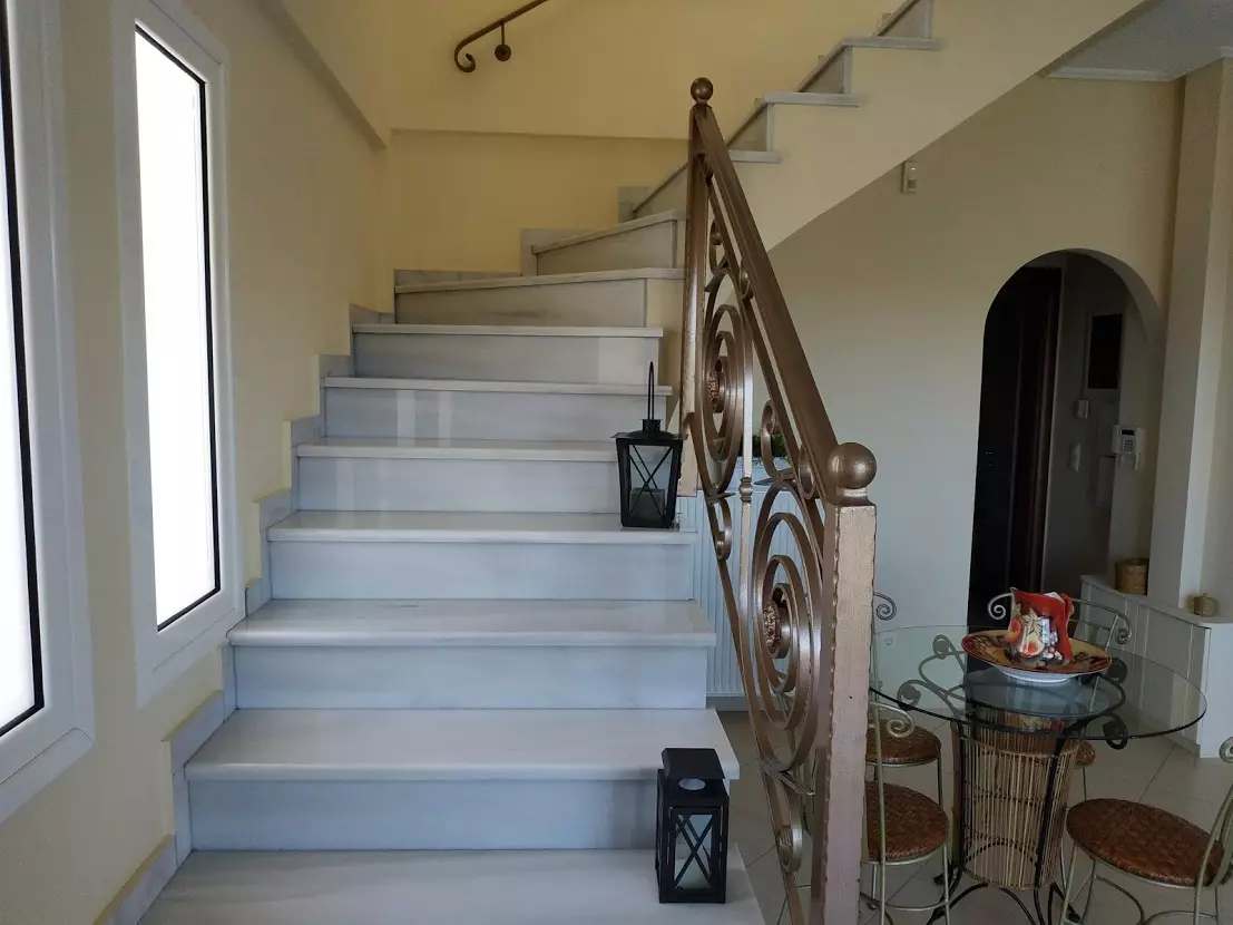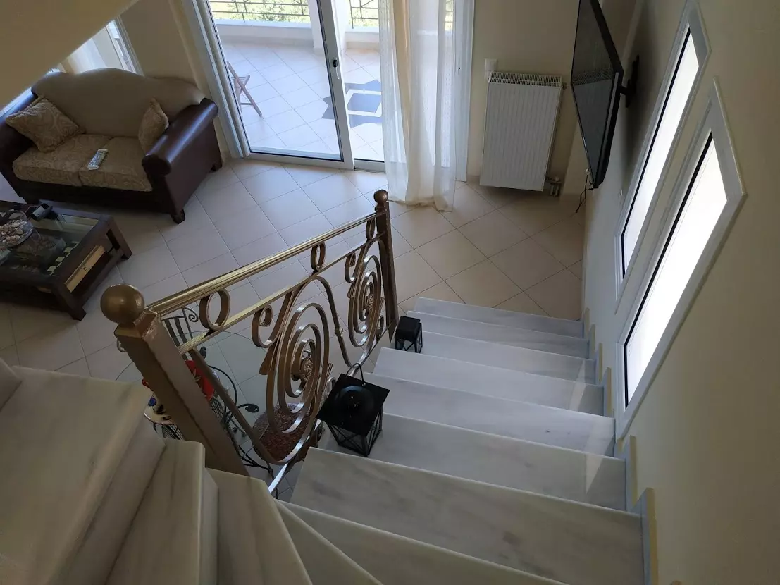 The 108 sq.m. maisonette is arranged over two levels. The lower level includes a living room with fireplace, kitchen, one bedroom, a bathroom, and balconies. An internal marble staircase leads to the upper floor, where there are 2 bedrooms, a bathroom, and spacious verandas with open views across the green surroundings. The property is equipped with aluminum electric window frames with insect screens, three air conditioning units, autonomous central heating (Buderus), and a solar water heater.