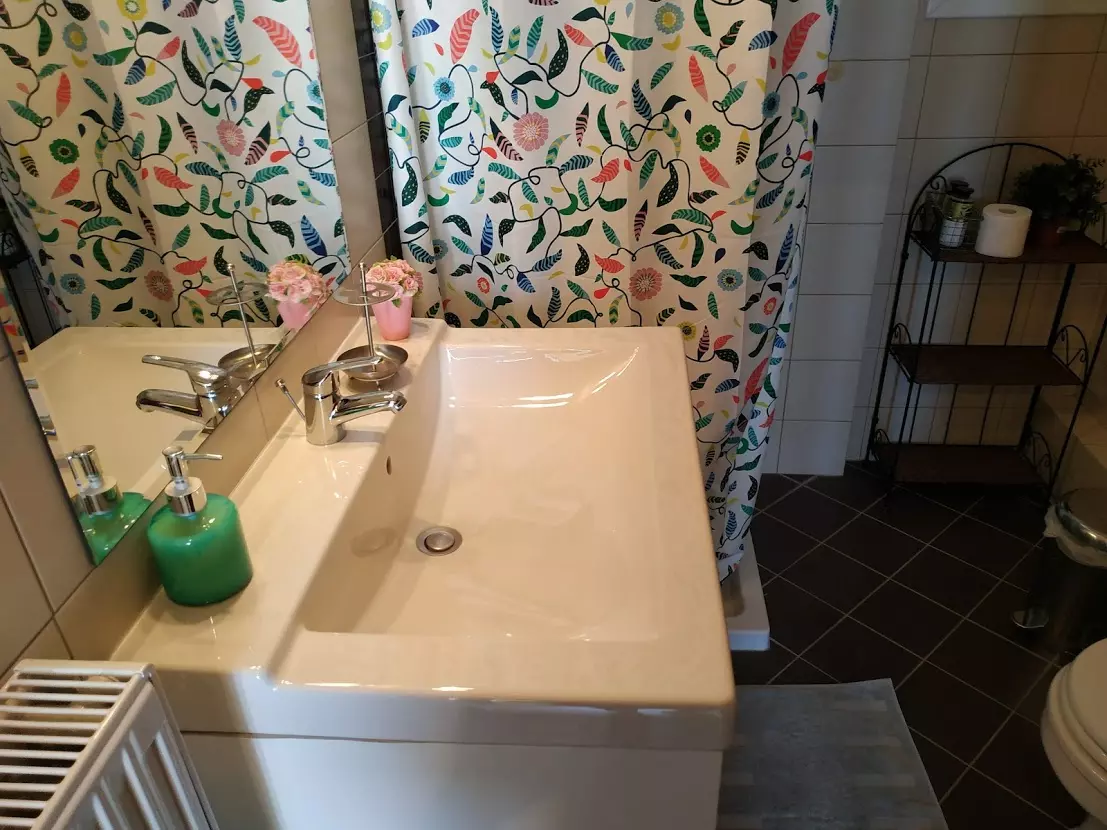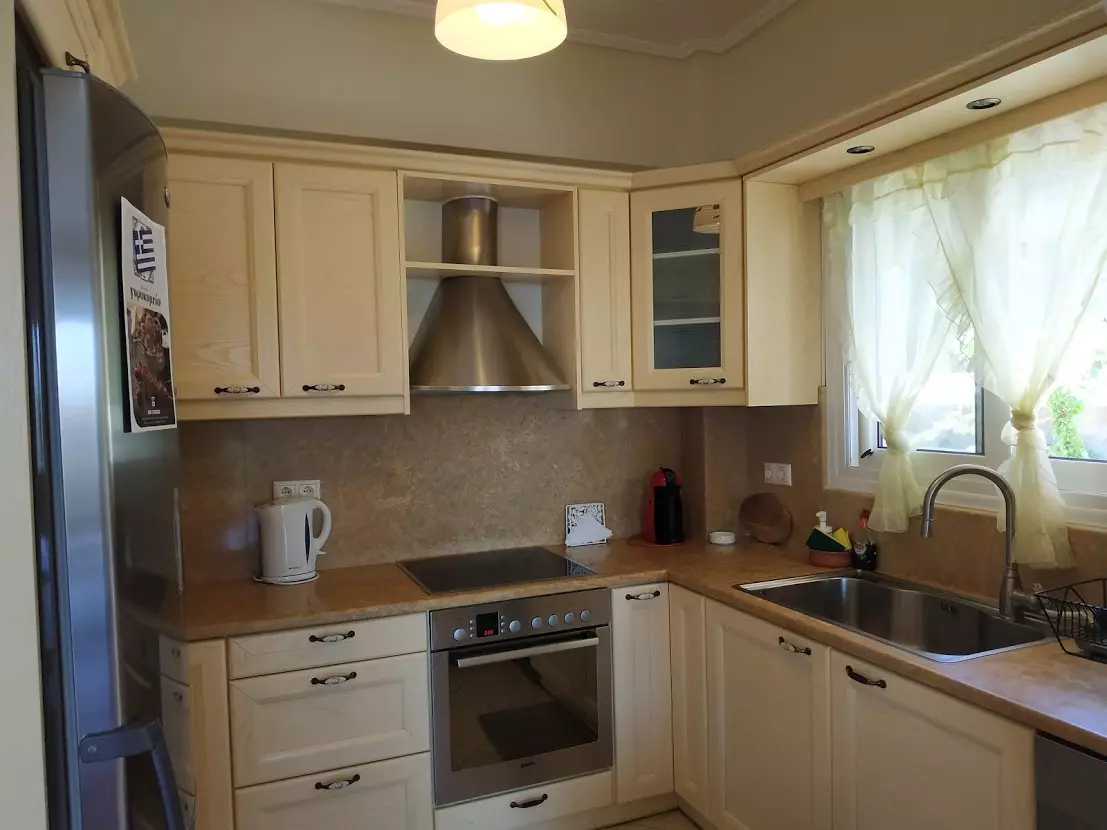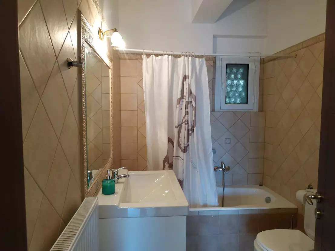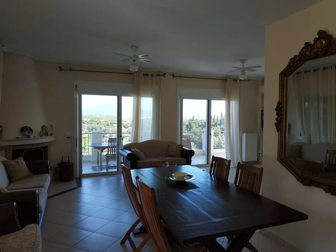 The 108 sq.m. maisonette is arranged over two levels. The lower level includes a living room with fireplace, kitchen, one bedroom, a bathroom, and balconies. An internal marble staircase leads to the upper floor, where there are 2 bedrooms, a bathroom, and spacious verandas with open views across the green surroundings. The property is equipped with aluminum electric window frames with insect screens, three air conditioning units, autonomous central heating (Buderus), and a solar water heater.