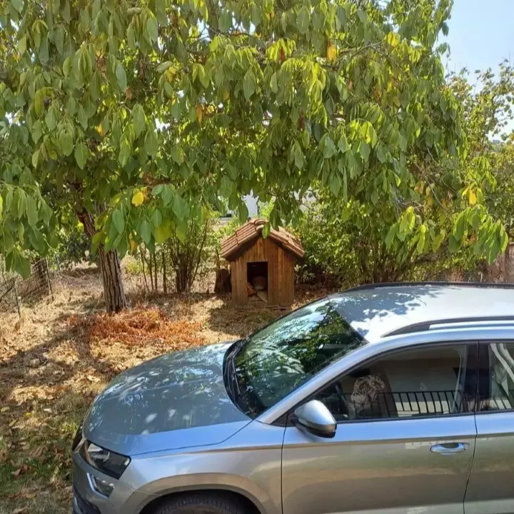 The home offers views of the city, mountains, and forest. Large windows allow natural light, enhancing the living space. Key features include solar panels for water heating and a fireplace, providing efficient heating solutions. The property also includes a designated parking space and a garden, which could serve various purposes including landscaping or recreational use.