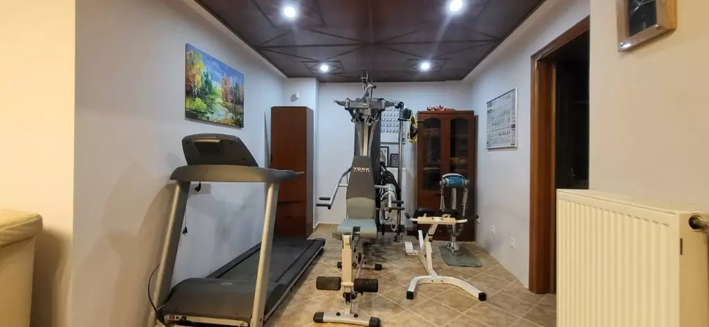 The ground floor includes two bedrooms, a living room paired with a kitchen, and one shower WC. Additionally, it features a storeroom, an office, and a gym area. This setup provides functionality whether you are looking to host, work from home, or unwind.
