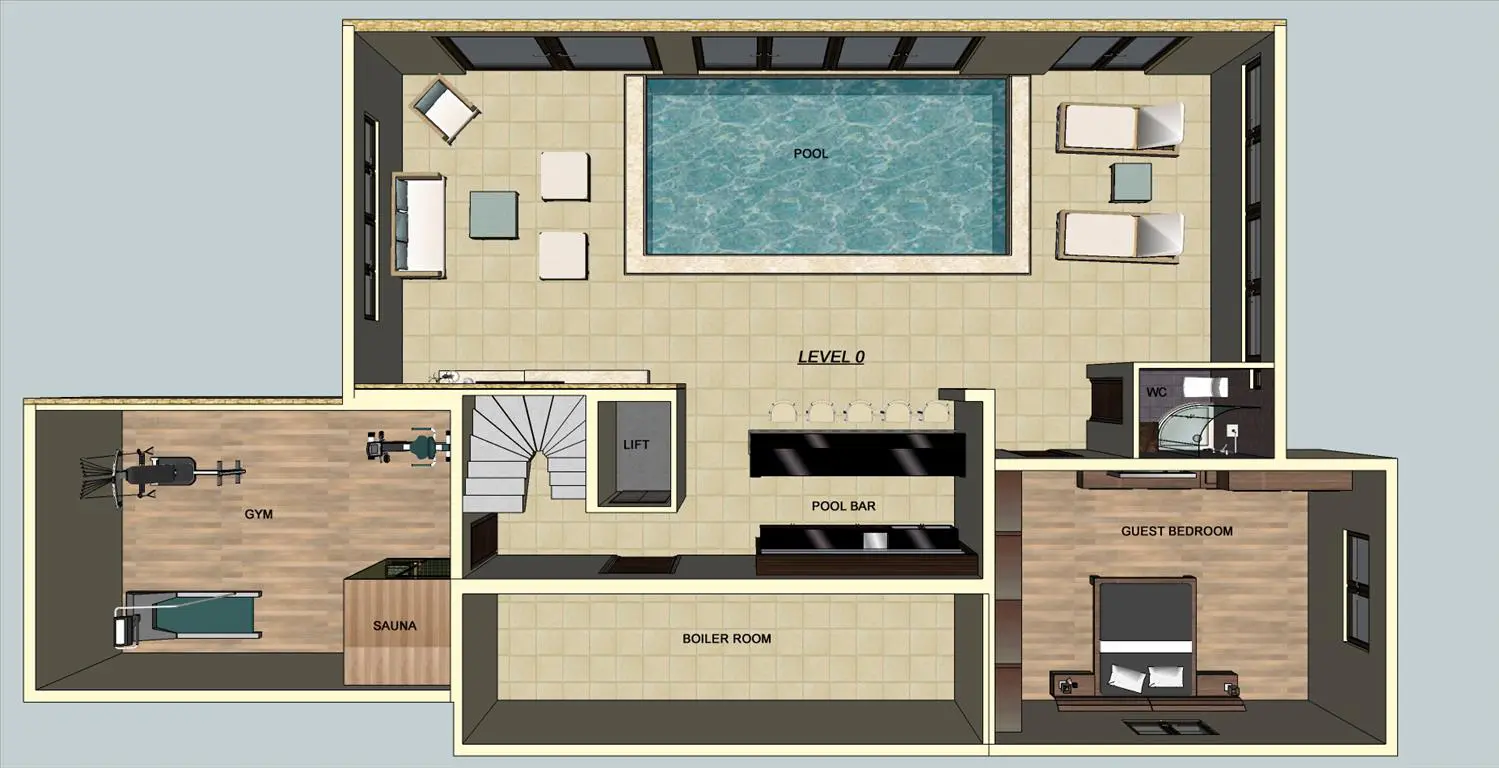 The semi-basement features two storerooms, providing ample storage solutions. Moving to the ground floor, you’ll find one bedroom alongside a living room, creating a comfortable area for daily activities.