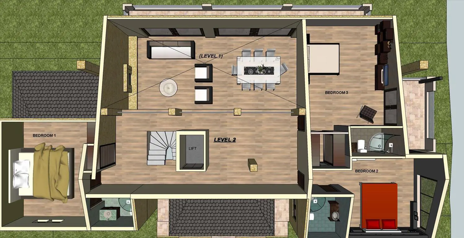 The first floor includes an additional bedroom, a living room, a functional kitchen, and a bathroom, ensuring all essential amenities are within reach. On the second floor, three bedrooms are accompanied by a living room and three bathrooms, allowing for greater flexibility and convenience.