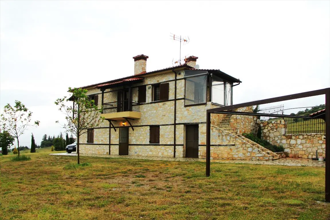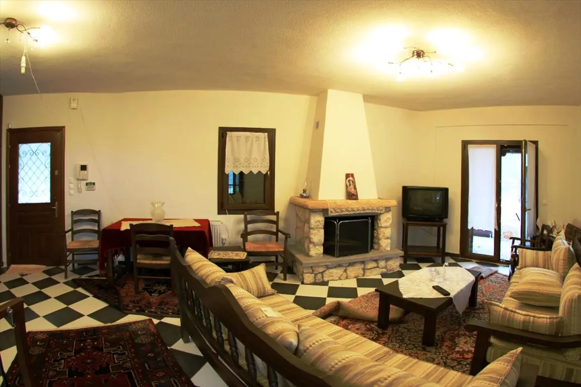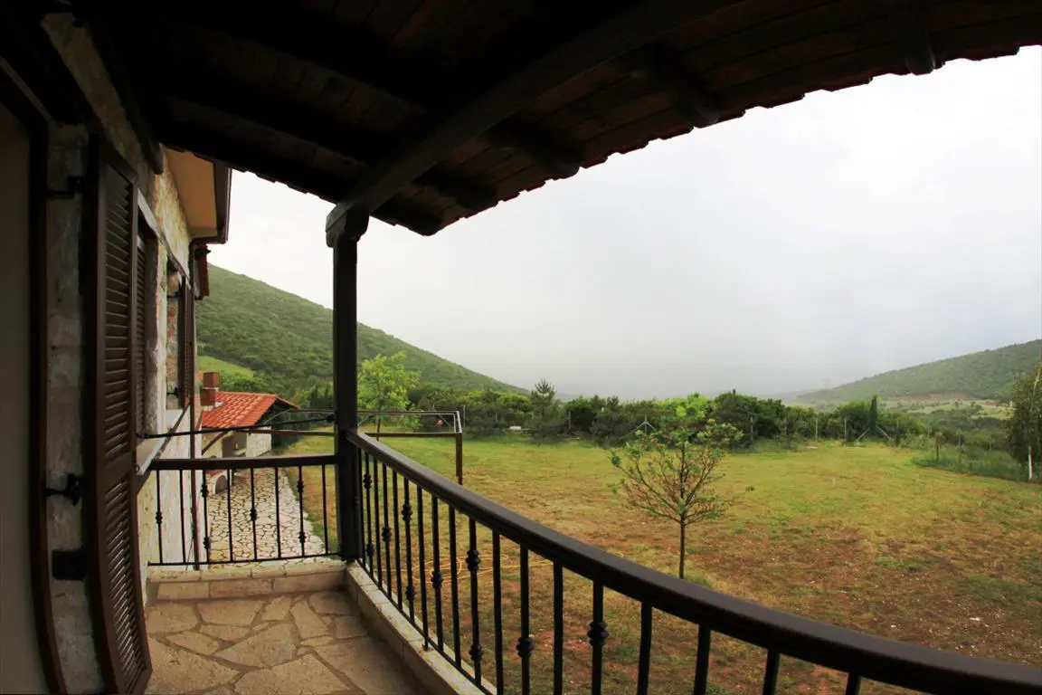 The property boasts impressive views of the sea, mountains, and forest from the windows, enhancing the natural landscape around the house. The outdoor area includes a garden and a barbecue space, perfect for enjoying the pleasant climate of Chalkidiki.