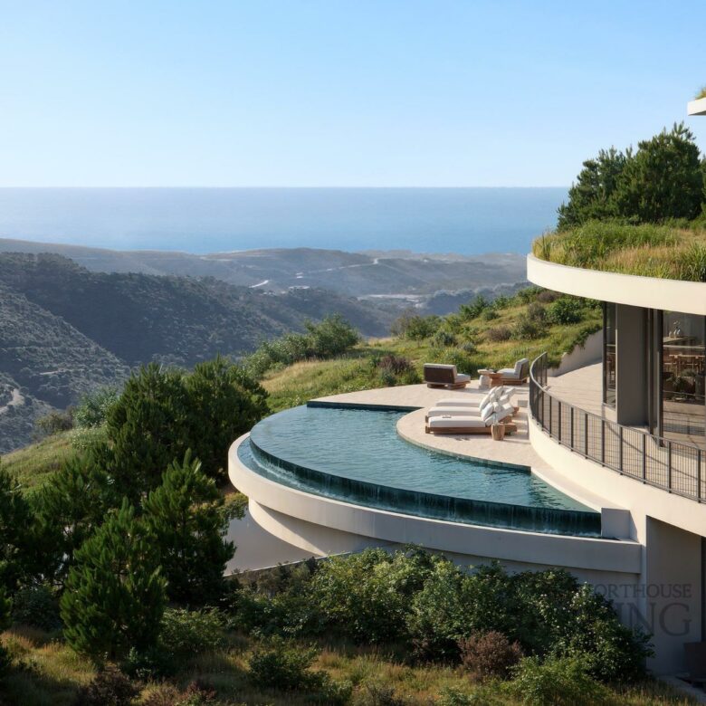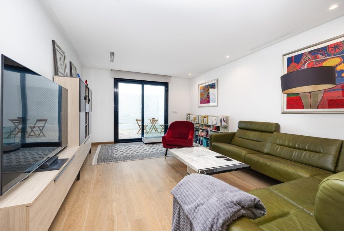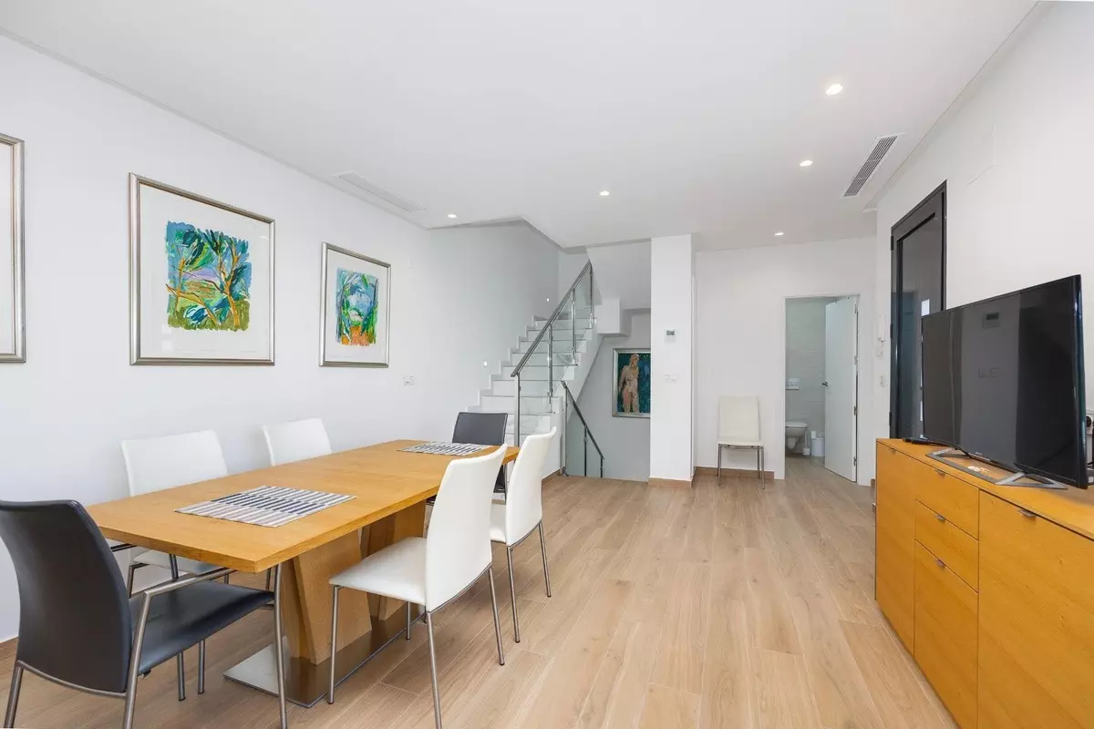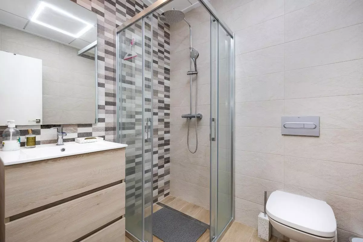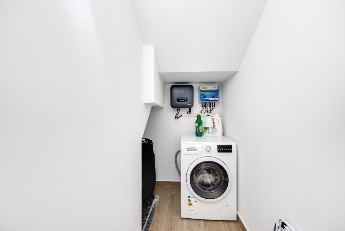 On the ground floor, you will find a modern open-plan kitchen that flows into a dining area. This level also includes a laundry room, one bathroom, and one bedroom equipped with sliding doors that open directly to the terrace and pool area. An internal staircase leads down to a lower level, which houses a living room and an adjoining terrace, as well as a sauna, storage room, and another bathroom.