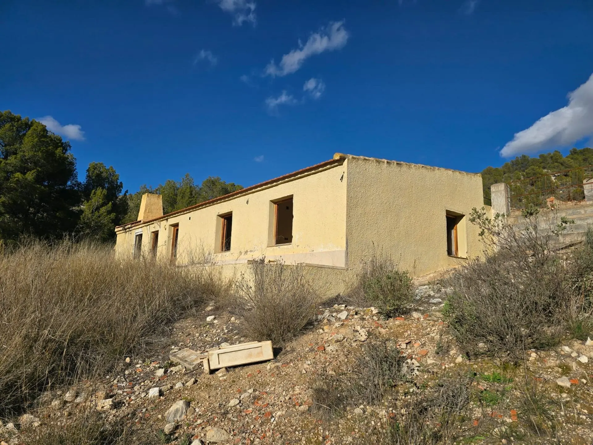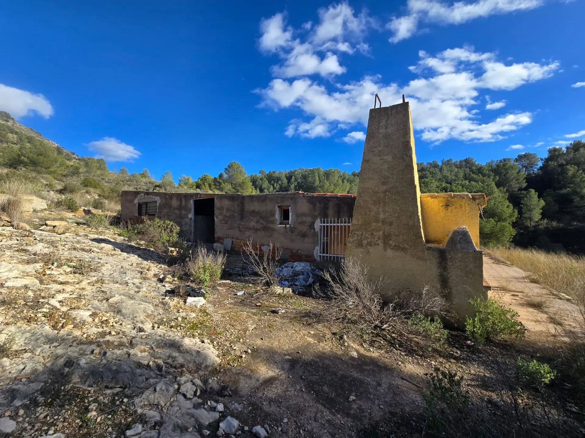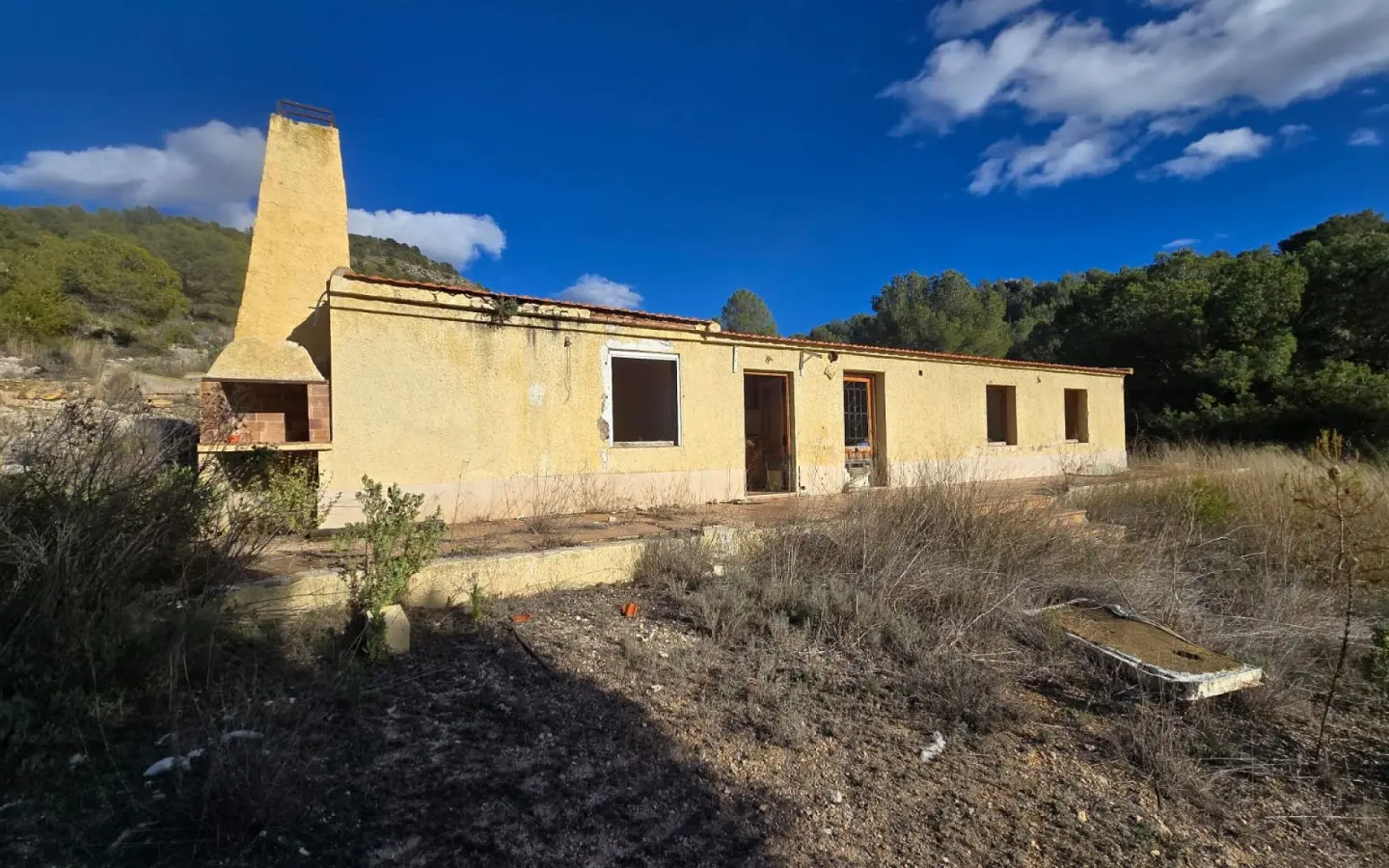 Requiring a solar system installation (although we believe mains may be possible, but it would be expensive to install), the house is in a poor condition at the moment, but this could be fixed up by a competent DIYer over a few weekends. A roof leak caused the current owners to abandon the property, and with this leak fixed, the house could be restored to its former condition quite easily. There are a large amount of outbuildings, still in fair condition, and a secure storage room to the rear of these, where the solar system used to be installed.