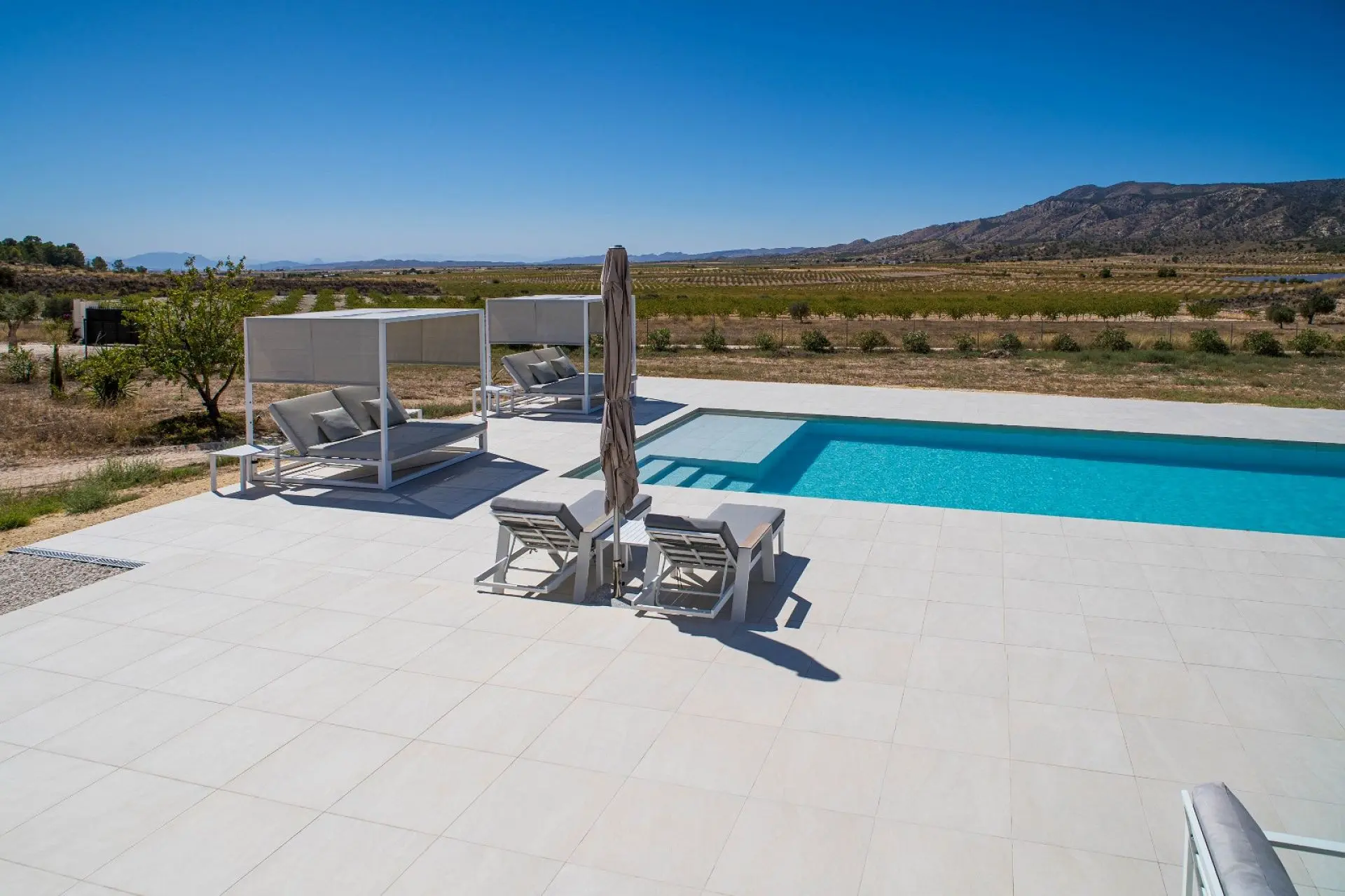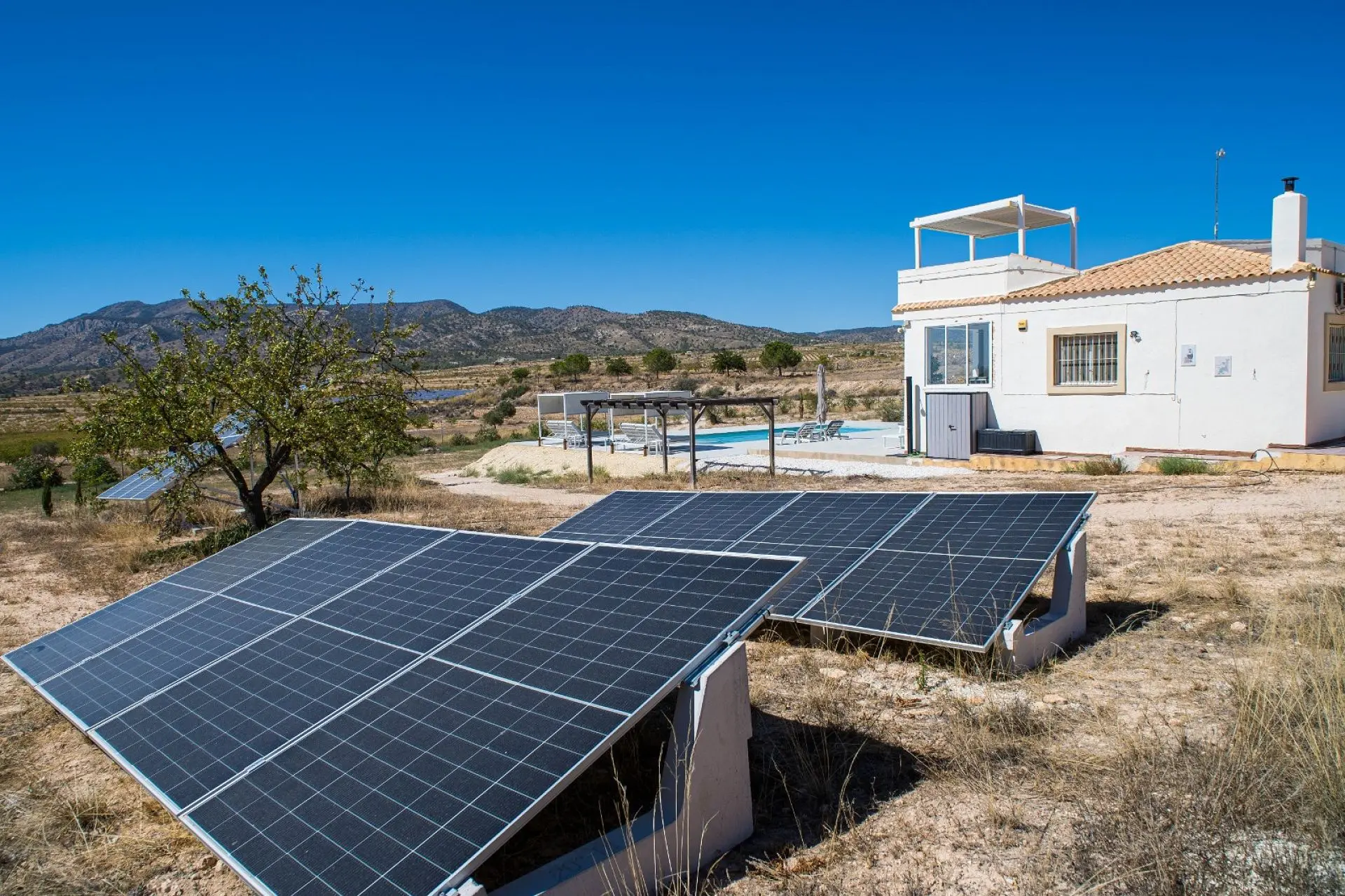 Just 5 kilometers from the lively town of Pinoso, this modern villa is ideal for those seeking peace and comfort combined with proximity to amenities. The property sits on an 8,283 m² plot planted with almond and fruit trees and offers stunning views of the surrounding countryside and the hills of the Sierra del Carche.