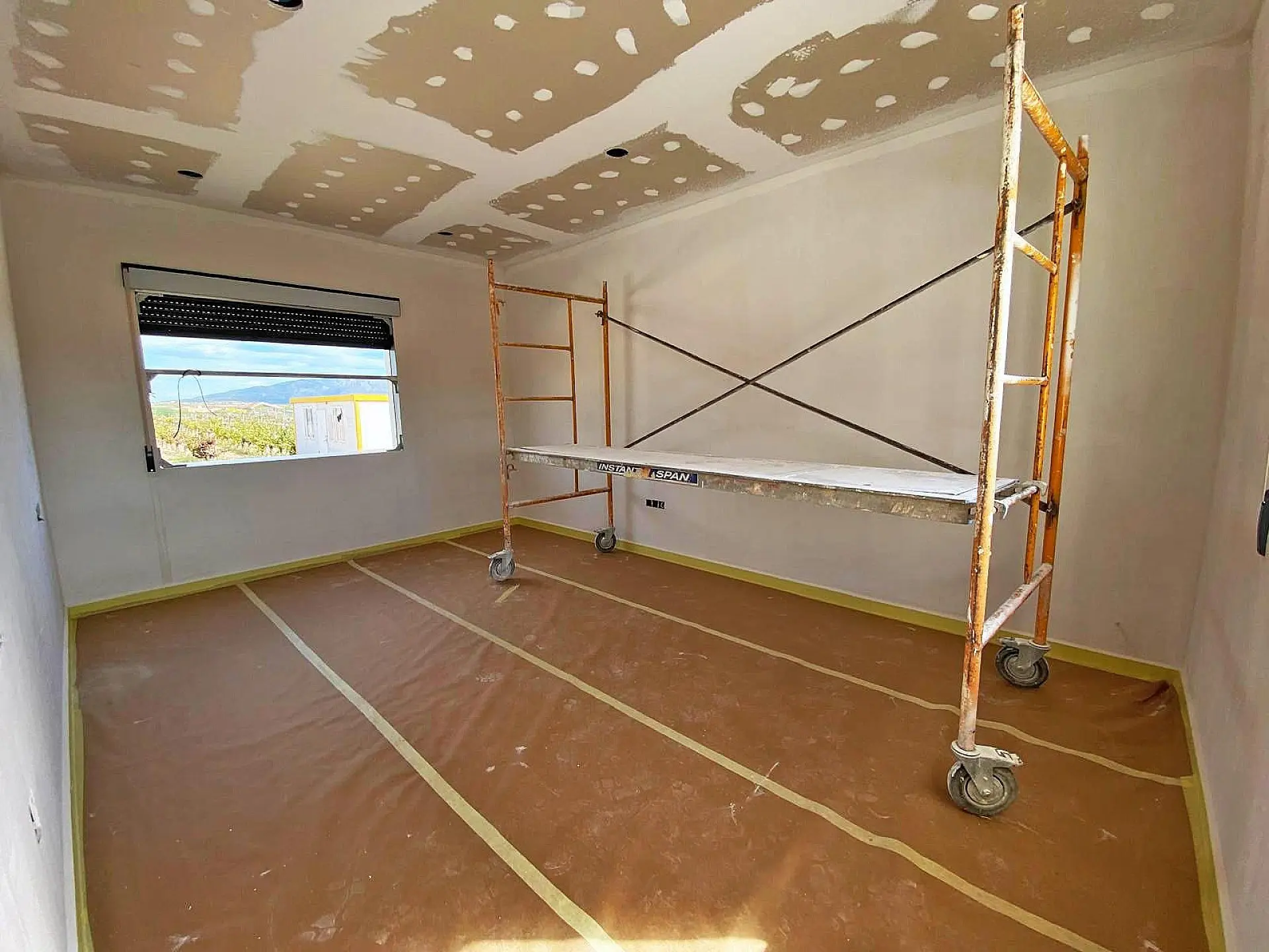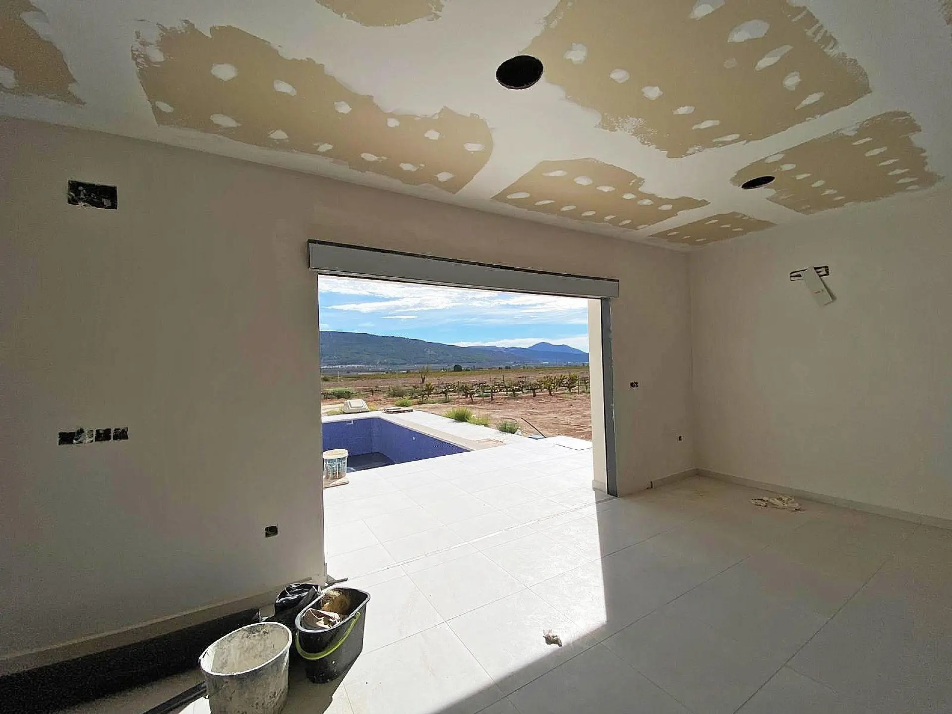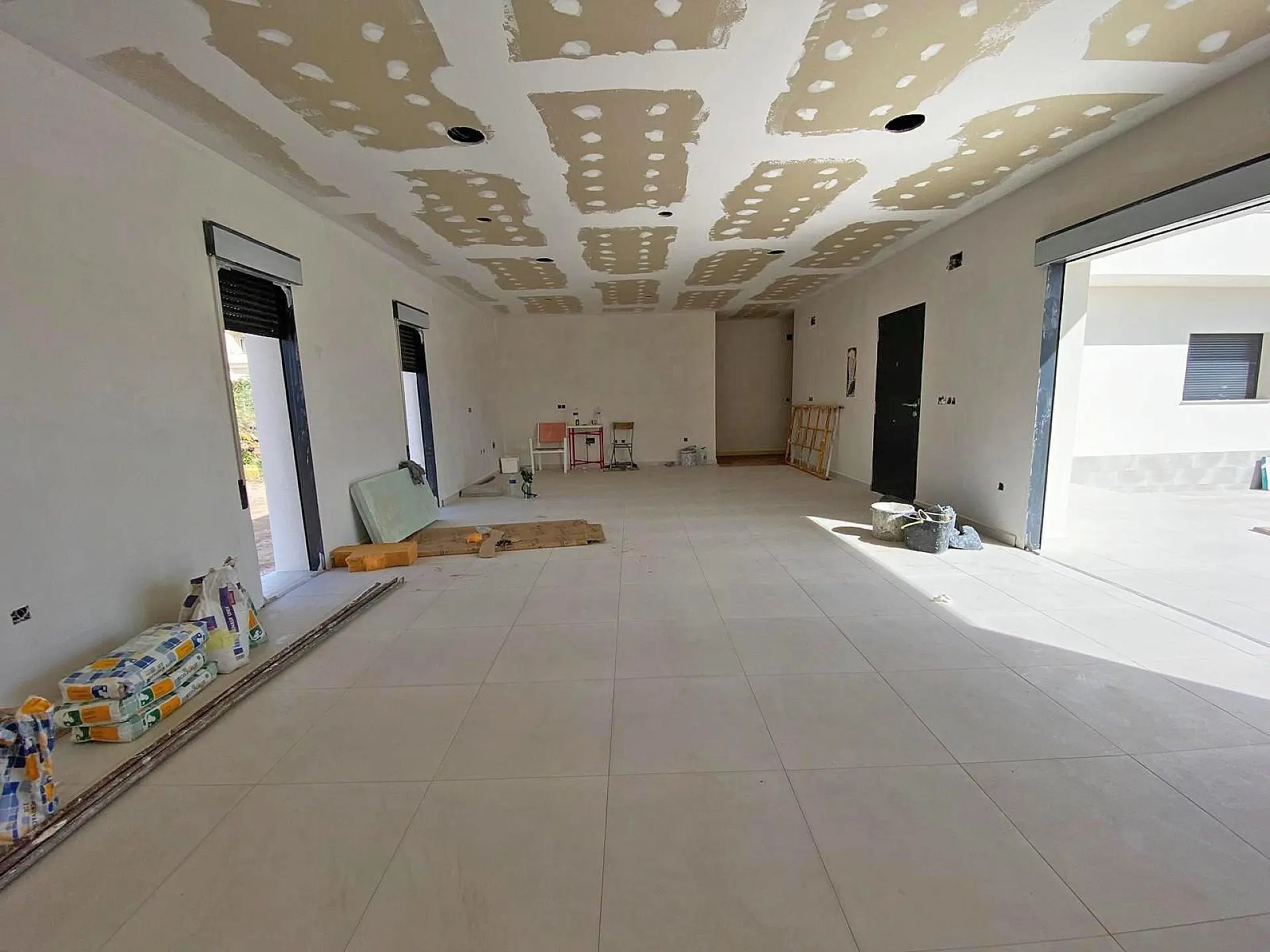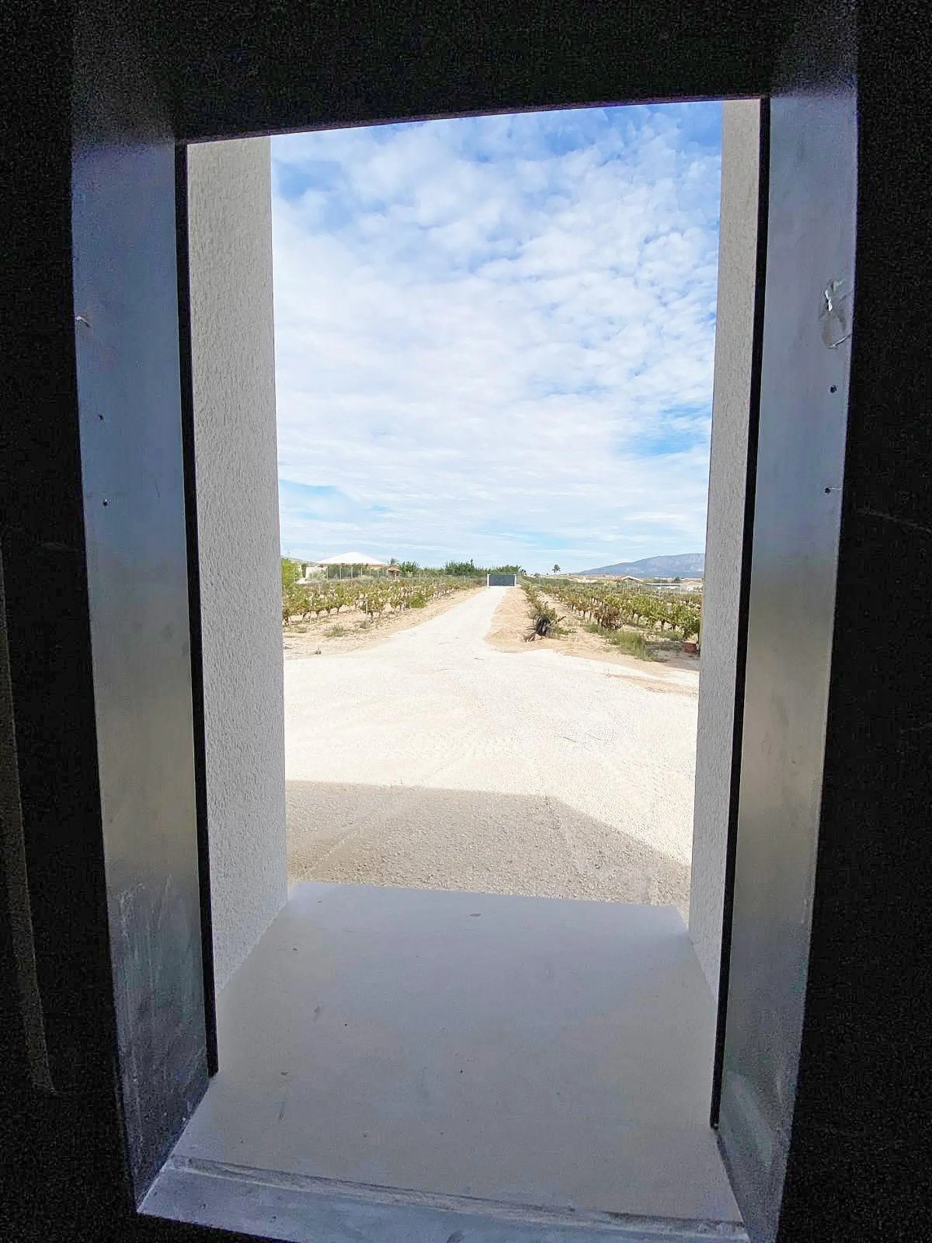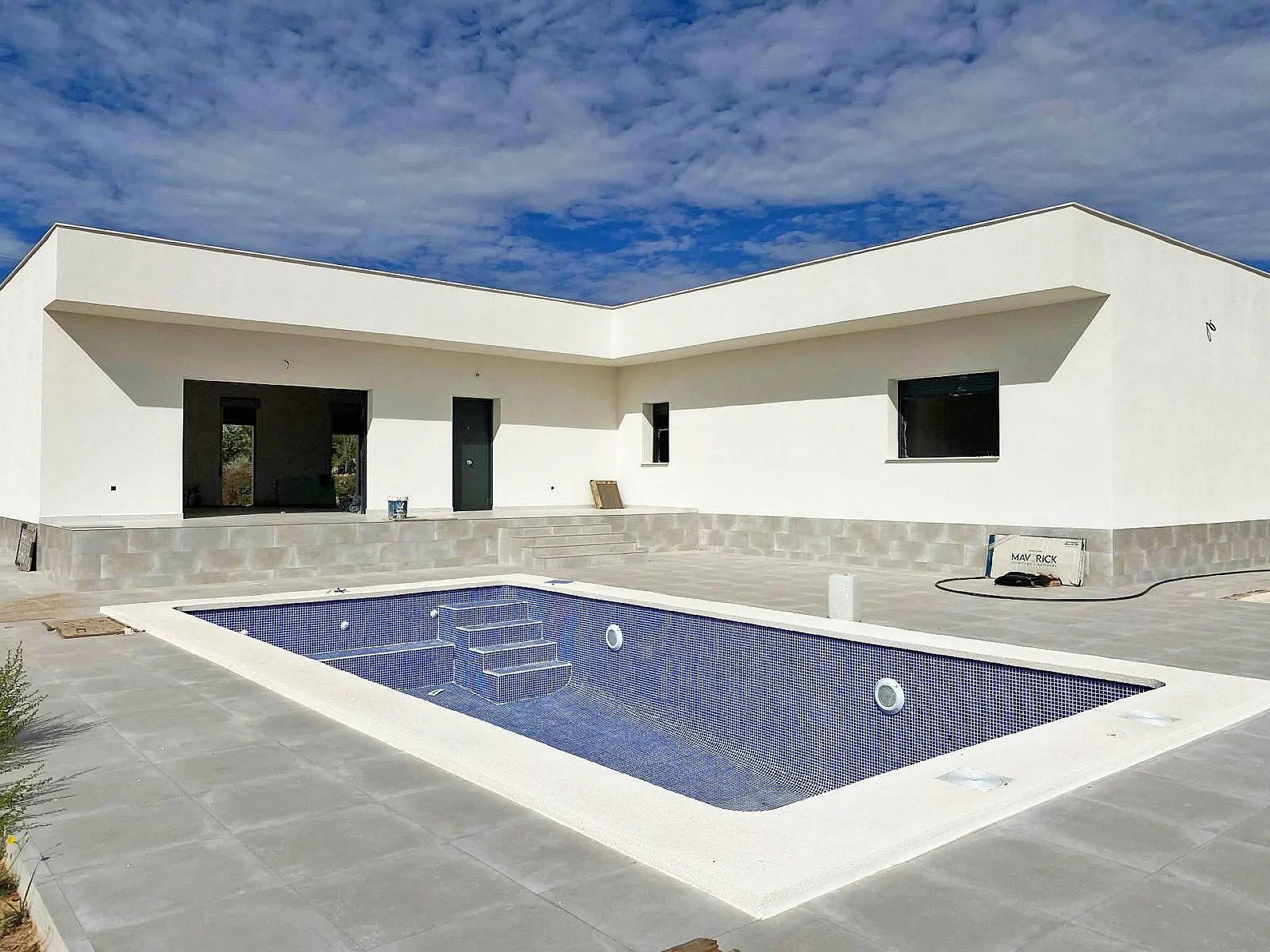 This new modern-style villa is nearing completion. The villa is located in Pinoso, 5 minutes walking distance where you will find all amenities. The villa is 160m² big and comprises a large living area with lounge/dining room and fitted kitchen (for €3,000) a laundry room, 3 bedrooms, 2 of them with fitted wardrobes and 1 Bedroom with an ensuite Bathroom. There is also 1 guest Bathroom. The villa has pre-installation for air-conditioning throughout the house (hot/cold), running water and electricity. The plot is 10,000m² large, of which 3,000m² has been fenced off. There is an 8x4m swimming pool with outdoor shower. Access to the property is via an electric gate. There is a choice of finishes and extras (kitchen, bathroom, etc.). If you’re looking for a new build but don’t want to wait months, this villa is for you.