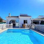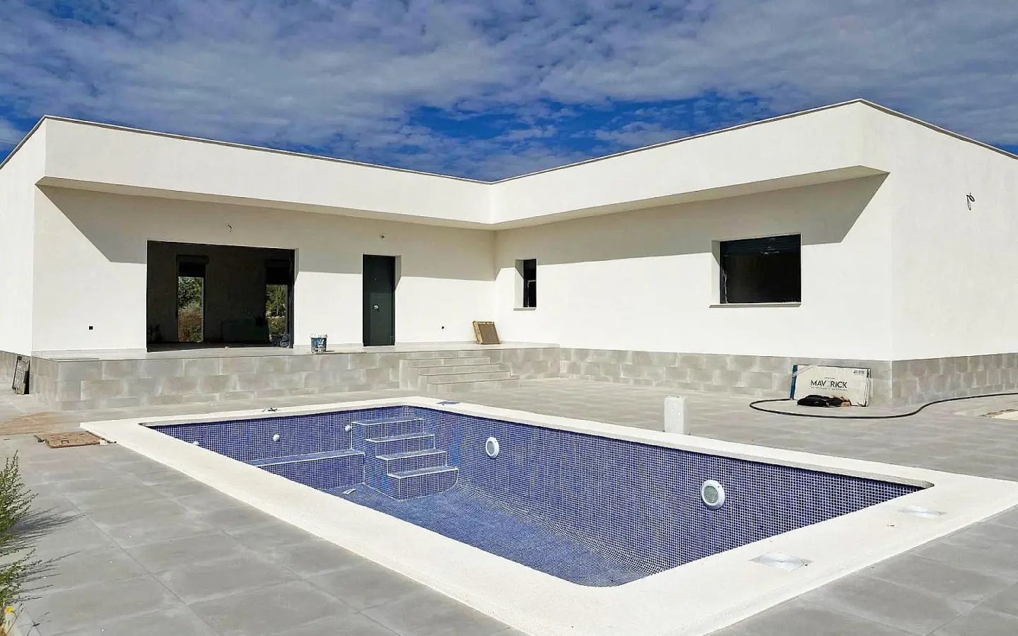 This new modern-style villa is nearing completion. The villa is located in Pinoso, 5 minutes walking distance where you will find all amenities. The villa is 160m² big and comprises a large living area with lounge/dining room and fitted kitchen (for €3,000) a laundry room, 3 bedrooms, 2 of them with fitted wardrobes and 1 Bedroom with an ensuite Bathroom. There is also 1 guest Bathroom. The villa has pre-installation for air-conditioning throughout the house (hot/cold), running water and electricity. The plot is 10,000m² large, of which 3,000m² has been fenced off. There is an 8x4m swimming pool with outdoor shower. Access to the property is via an electric gate. There is a choice of finishes and extras (kitchen, bathroom, etc.). If you’re looking for a new build but don’t want to wait months, this villa is for you.