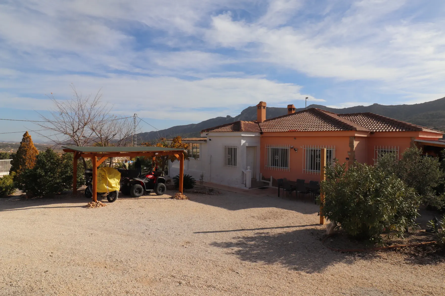 This superb villa in perfect condition is located halfway between the 2 villages of La Romana and Alguena with all amenities (health center, pharmacy, supermarkets, restaurants, weekly market, DIY stores etc). A beautiful terrace overlooking the pool (10×5) offers extraordinary views of the surrounding mountains. The main villa, renovated with taste and quality materials, consists of a spacious veranda (30m2), a living room, a dining room, a kitchen, a pantry, 3 bedrooms, and 2 bathrooms including one en suite. It benefits from air conditioning, gas central heating, and an internet connection. On the side of the property, there is also a chalet with an additional bedroom (9.5m2) with a toilet and a shed (10m2). There is also another construction of 28m2 including a carport and a laundry/shed. This property is connected to the power grid but also has 10 photovoltaic panels and a 5kw inverter. A 25,000-liter water depot with a brand new pump ensures the supply of the house. Alicante airport and the coast are about 45 minutes away.