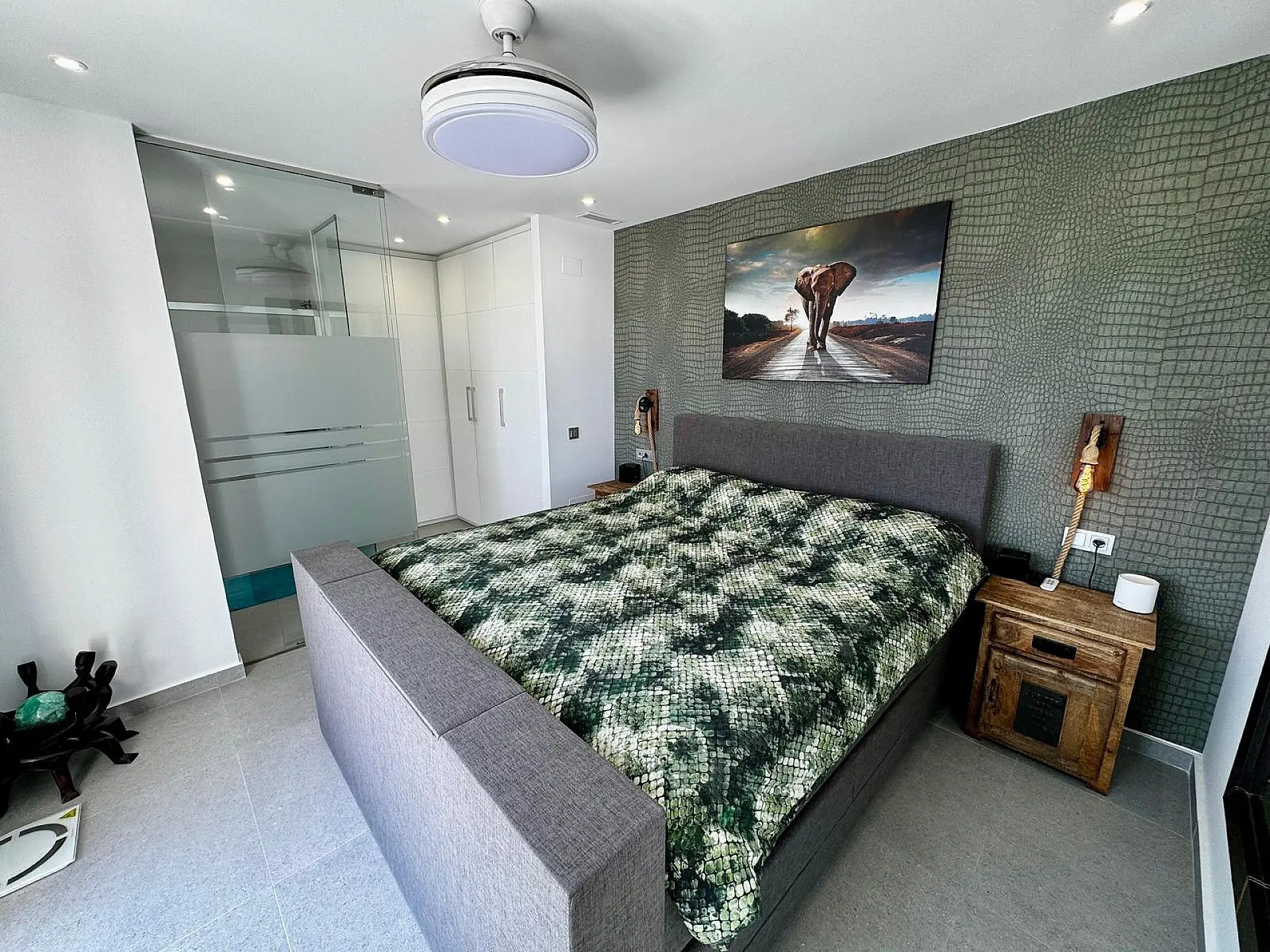 As you walk through the outer gate and up the steps, you have a private pool to your right and access to the underground car parking/garage to your left. The lower terrace runs the full length of the front of the villa and provides ample room around the pool to relax and soak up some sun. Upon entering the property through the main entrance, you will find the living area to your left, which has a lot of natural light due to glass sliding doors that provide access out to the pool and terrace. This creates a seamless transition between the indoor living space and the outdoor area. The living area includes stairs on the right that lead both down and upwards. Inside the living area, the current owners have created a seating zone and a dining area for entertaining family or friends. At the far end, there is the kitchen, which is well designed with high-quality appliances. An island worktop creates a natural divide between the kitchen and living area, and there’s a utility area where the boiler and washing machine are situated. On returning to the far end of the living area, you will find a toilet/cloakroom followed by the first bedroom, which has wardrobes and a private en-suite shower room.