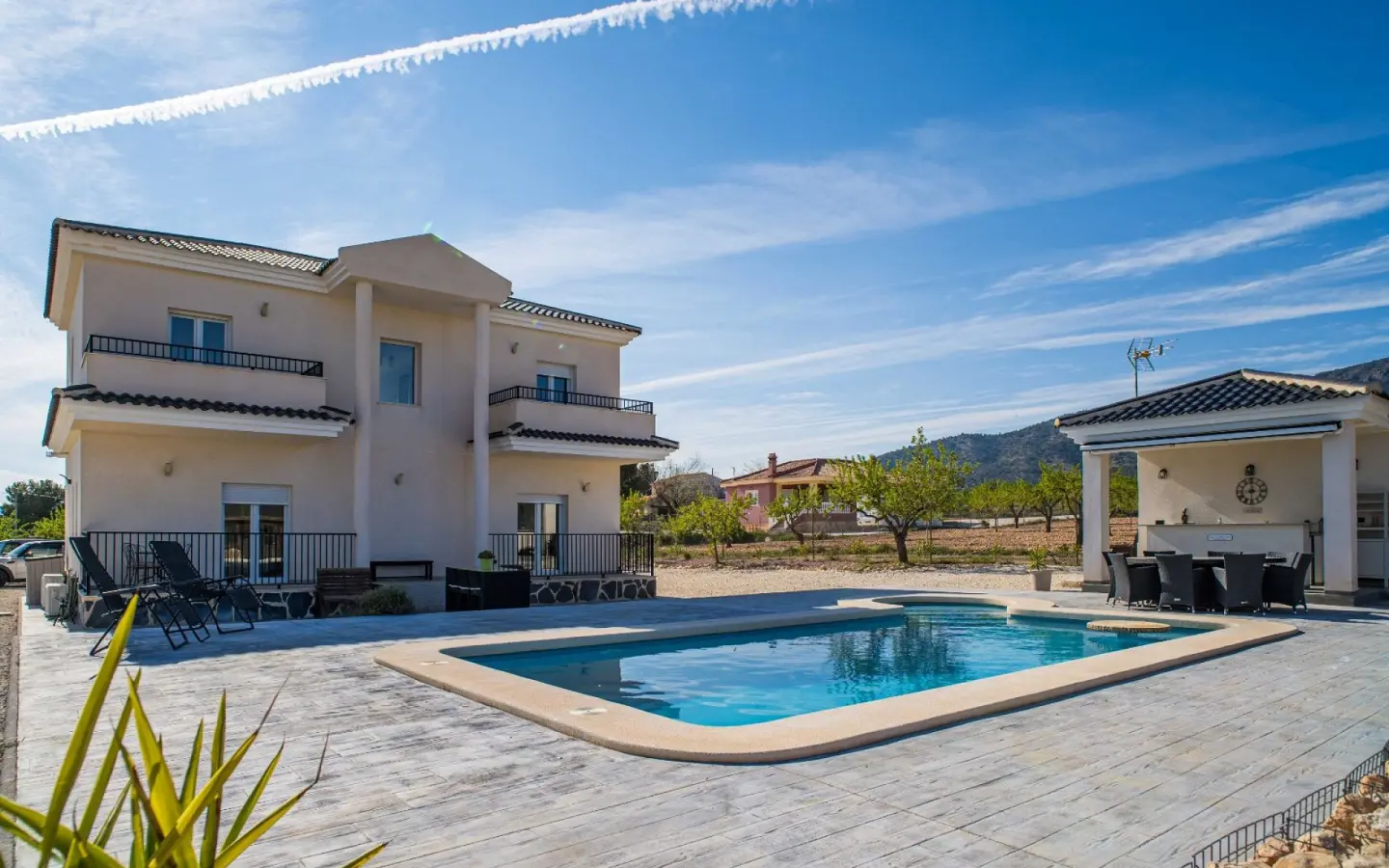 Nestled in the serene rural landscape of LEL, a mere 15-minute journey from the vibrant town of Pinoso, stands a substantial villa situated on an expansive parcel of land exceeding 12,000 square meters. The property is encircled by established almond trees, offering unobstructed vistas of the surrounding terrain. This residence is designed to provide a private, peaceful, and well-appointed living environment within a natural setting.