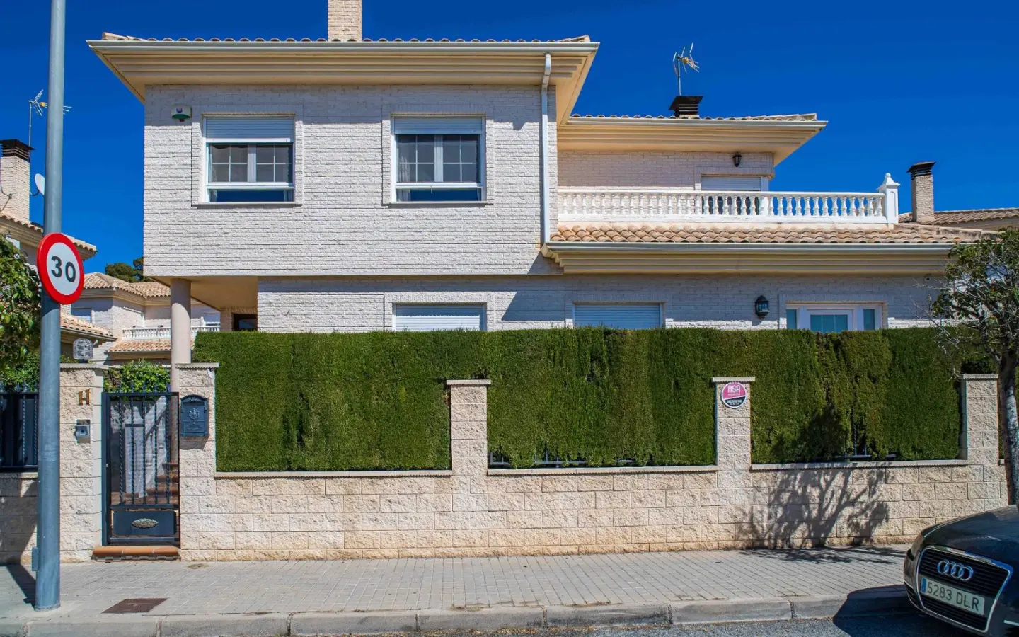 The property is equipped with several systems for comfort and security. Climate control is managed through a zone-controlled central heating system and individual air conditioning units for each room, allowing for tailored temperature settings. On the ground floor, the windows feature automatic roller shutters. For communication and security, there is a video intercom system. Additionally, a comprehensive alarm and security system is installed throughout the house.