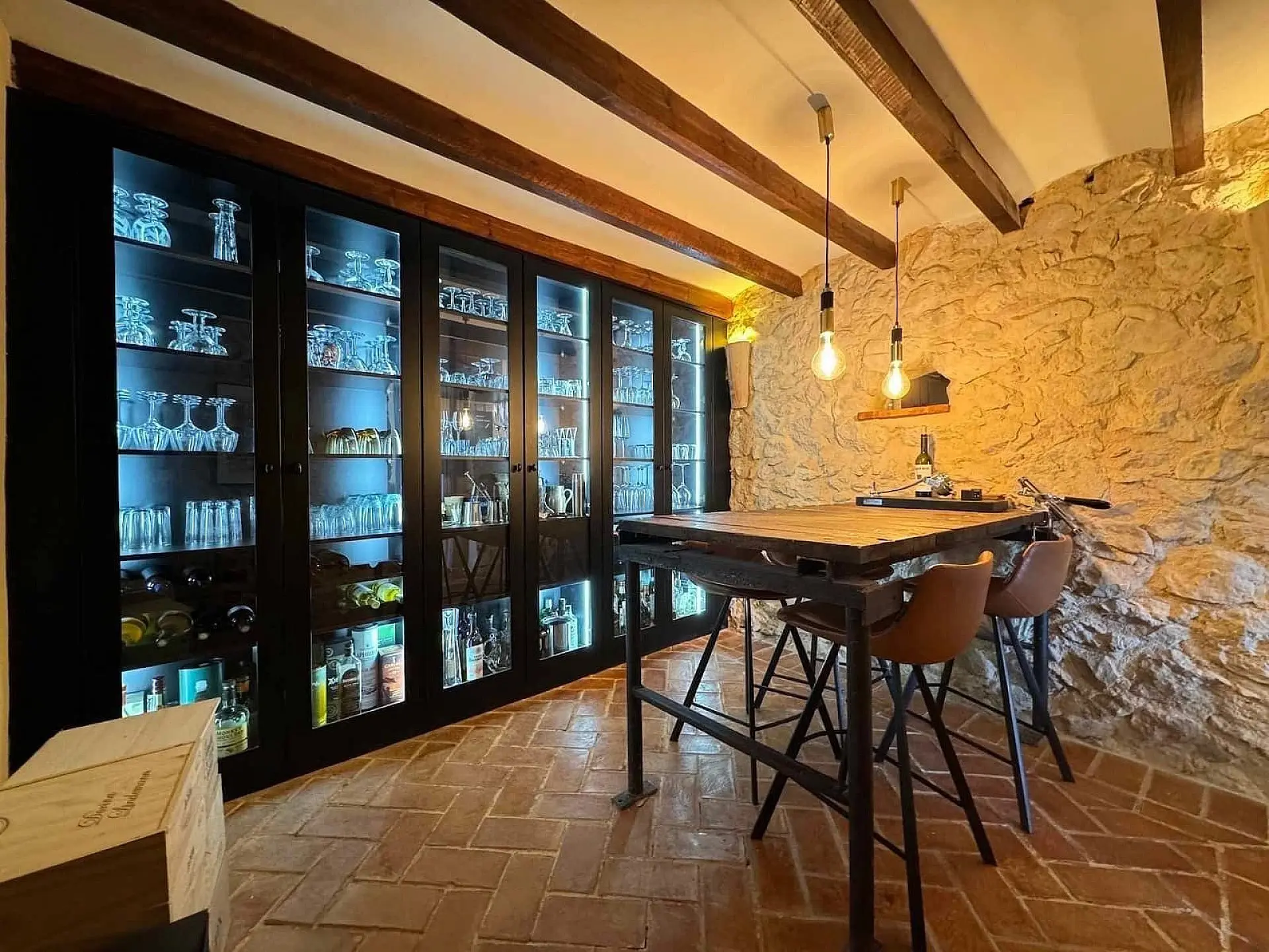 The kitchen is practical and well-designed, and if you enjoy a good drink, you’ll love the private wine cabinet room. It has a glass display for your favourite bottles, plus a vintage carved style table.