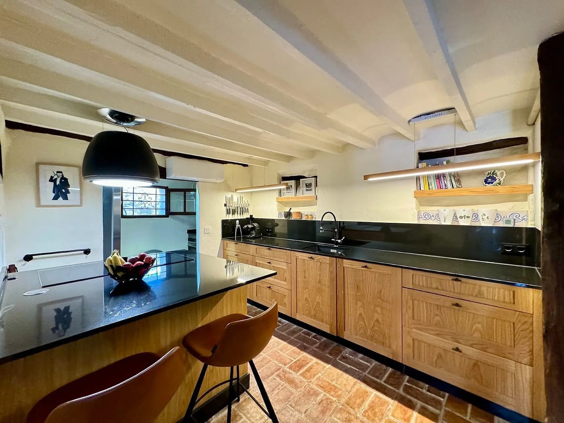 The inside is a mix of traditional and modern designs from beautiful handmade brick floors, exposed wooden beams, timber shutters, and natural stone walls—full of rustic character! The open-plan living and dining area is bright and spacious, with a vintage-style log stove that makes the whole space feel cosy. Big sash windows let in loads of natural light.
