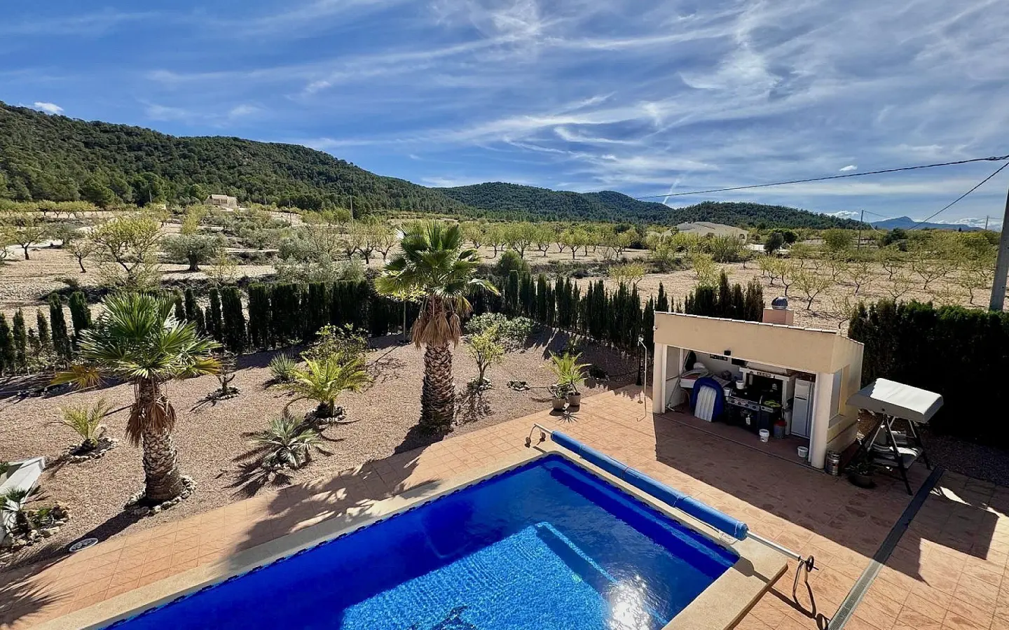 Inside, the villa is set up for comfortable living. There are four bedrooms, offering good space for a family or for hosting visitors. You’ll find three bathrooms, with two of them being en-suite, which is always a convenient feature. To keep things comfortable and practical, the windows are fitted with mosquito screens and electric shutters. This is a thoughtful touch, especially in warmer months, helping to keep insects out while also providing security and light control.