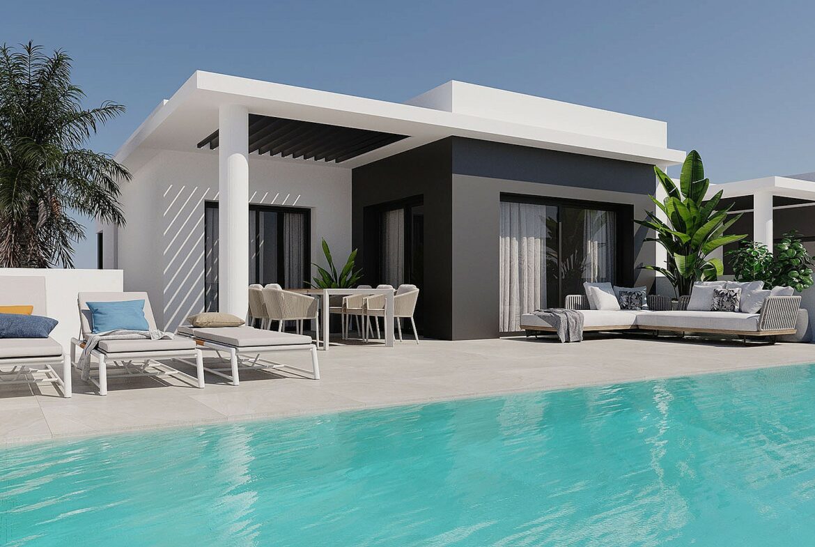 Each villa is positioned on a 300m² plot with a private pool and optimal sun orientation, providing open views of the surrounding mountains. The proximity to a golf course and local town enhances the location’s appeal.