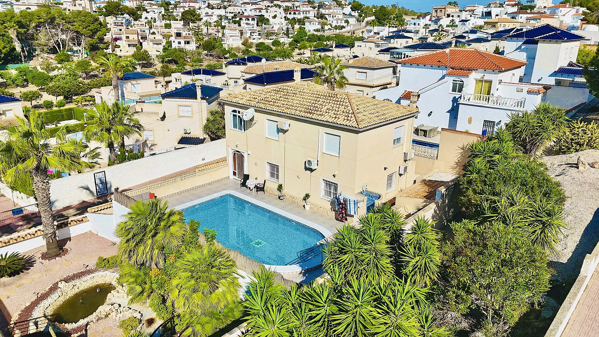The outdoor area adds charm as well. Situated on a 404m² corner plot, the villa includes a sizable private pool, ideal for lazy afternoons under the sun. Sun-drenched terraces are perfect for gatherings or quiet moments with a book. There’s plenty of outdoor space to entertain or unwind.