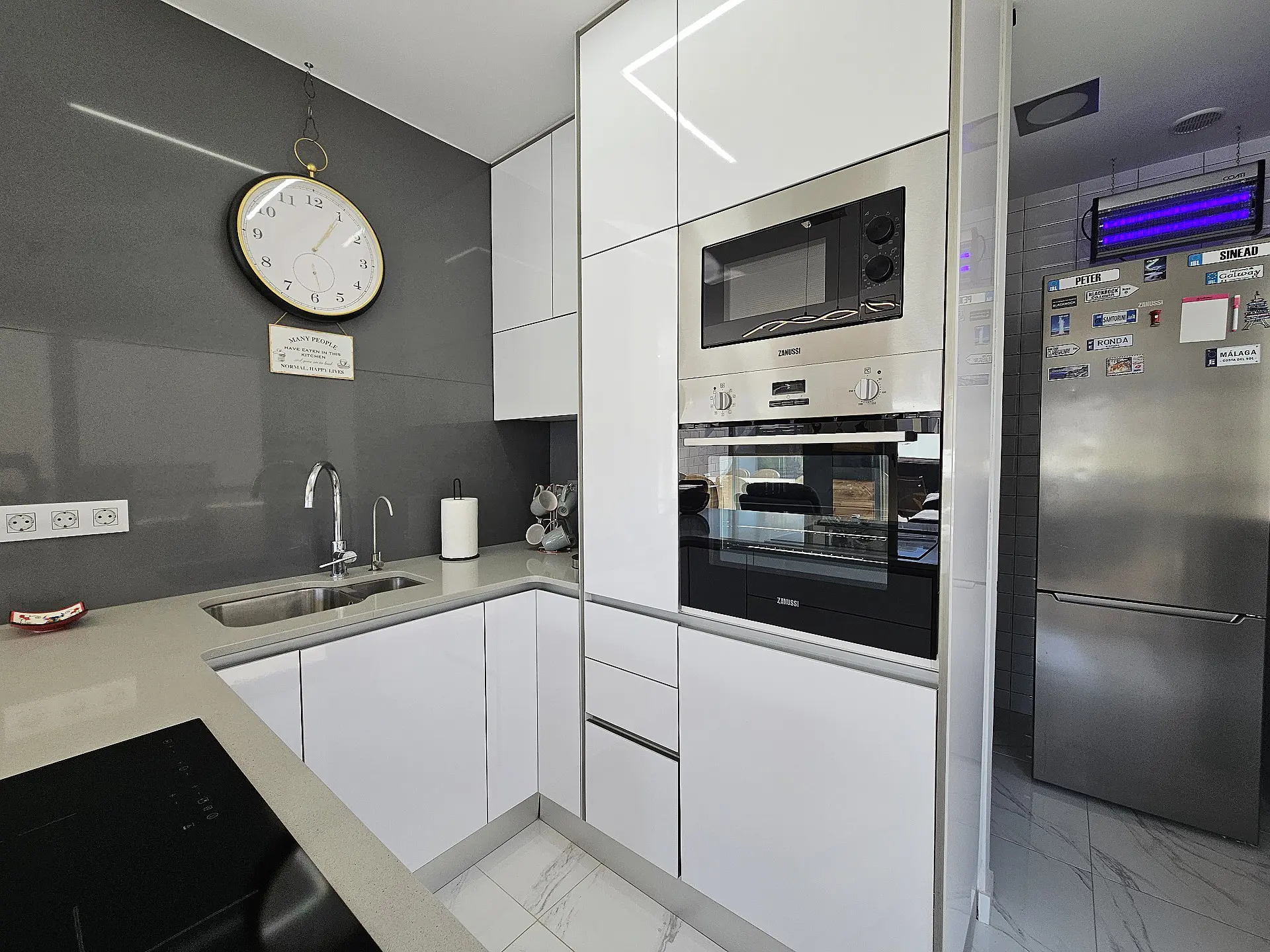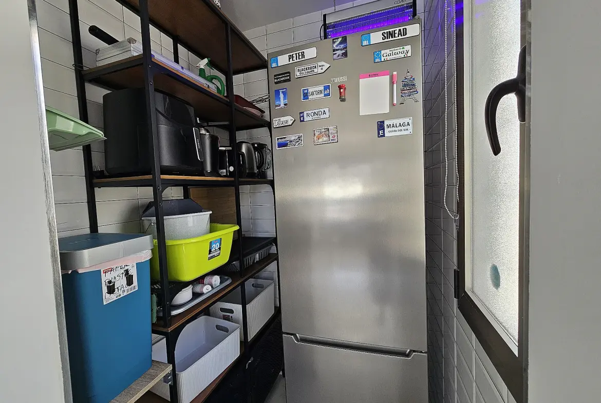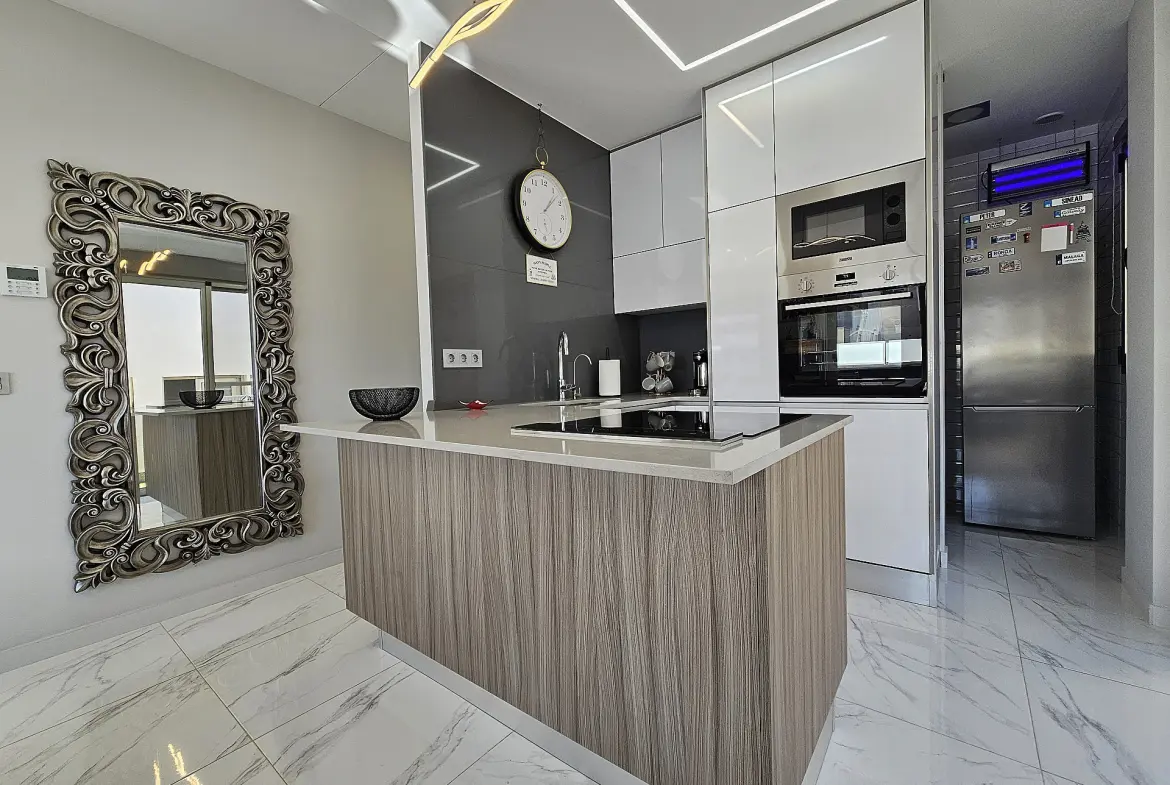 Upon entering, you are welcomed by a bright interior. High ceilings and French doors allow ample natural light to permeate the space, creating an open atmosphere. The upper level features an L-shaped living and dining area that transitions effortlessly into an open-plan kitchen. This kitchen offers generous storage options to keep everything organized. Additionally, there is a separate utility and laundry room that can be converted into a fifth bedroom if necessary.