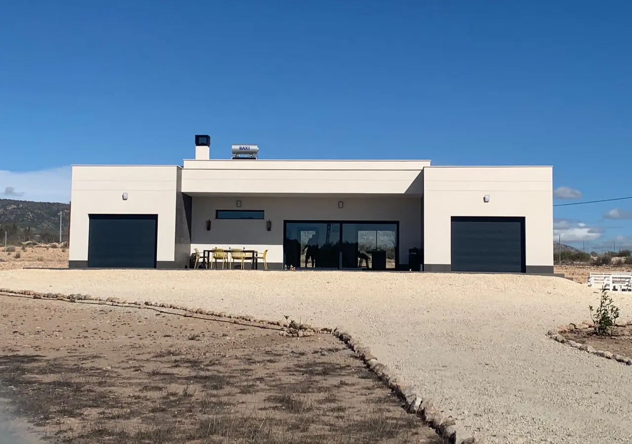 Dream New Build Villas in Alicante’s countryside. The modern design projects include electric blinds, pre-installation for CCTV, extensive floor and tile models according to the design of the project. More colors for kitchen furniture are included and the stair and exterior railings are made of glass. OPTION 145 MT2: House price and pool of 8×4 meters: 359.000 euros. Land price included: 30.000 euros. 3 Bedrooms and 2 Bathrooms OPTION 160 MT2: House price and pool of 8×4 meters: 389.000 euros. Land price included: 30,000 euros. 3-4 Bedrooms and 3 Bathrooms. OPTION 180 MT2: PUNCTUAL OFFER FOR THIS HOUSE: 489,000 euros. 180 MT2 AND ANNEXE OF 42 MT2 WITH SWIMMING POOL. All houses include 2m stamped concrete terrace around the pool (colour and pattern to choose), 1m around the house, gated entrance, 3000m2 fencing, pre-installed ducted aircon, standard kitchen, security door, German tilt and turn windows (or sliding if preferred), built-in fireplace and chimney, pre-installation for TV and internet, gravel driveway plus a few meters around the house, septic tank. Bathrooms include a shower column, shower tray or bath, sink units (various colours to choose from) with sinks, taps and mirrors, plus a big selection of wall tiles. Wide selection of ceramic floor tiles, different colours, wood effect, etc. Kitchens include cabinets with standard doors and handles, as per plans provided, stainless steel sink and tap, pre-installation for oven, dishwasher, extractor. Various granite worktops to choose from included in the budget, other stone worktops available as extras. Marble staircase (cream, white, or grey) and railings included, plus railings for the front porch. Big fixed glass window on the staircase for extra light. Choice of tiles and steps design for swimming pool. Choice of the granite for the houses’ exterior steps and window sills. We are the biggest and best builder in the area and use top quality materials for a perfect finish. Our great 10cm insulation all around guarantees at least an Energy Certificate B rating but an A in most cases (depending on house size and design), we have a big selection of tiles, plus kitchens and bathrooms included in your budget. We have different legal building plots, some walking distance to town, some totally private and our most popular ones are within 5-10 mins drive to a town. We have a plot for every taste, all with amazing views and all have mains water + electric included in the price and high speed internet available. The best plots with great views, mains water and electric are €45.000 minimum. You can customise the house to suit, most internal changes are free of charge, the houses can be extended and we can even build your own design. Upgrade to 10m x 5m pool €6000. Single or double garage can be added. Guest house also optional and customizable. All paperwork included (build license, habitation license, 10 year build guarantee, etc.) plus weekly reports and drone photos. Key in hand in 7-8 months from the first payment. EPC rating A (best around). These country residences are customised for each client’s personal tastes. The model shown in these pictures has an additional 30sqm guest house, and the clients added a BBQ & Summer Kitchen later on. The template villa offers 4 bedrooms, 4 bathrooms, large lounge with fireplace, kitchen with utility and a large covered porch as well as a couple of terraces off two bedrooms offering commanding views over vineyards or orchards. It also comes pre-installed for ducted cooling and heating with AC to all rooms to ensure year round comfort. We work with each client to design their dream villa in their unique way and assist every step of the way. Villa with traditional Spanish touches and super modern, bright and clean. The minimum plot size to be able to build on is 10,000sqm. Plots available with mains water, electric and high speed internet in Pinoso and other areas.