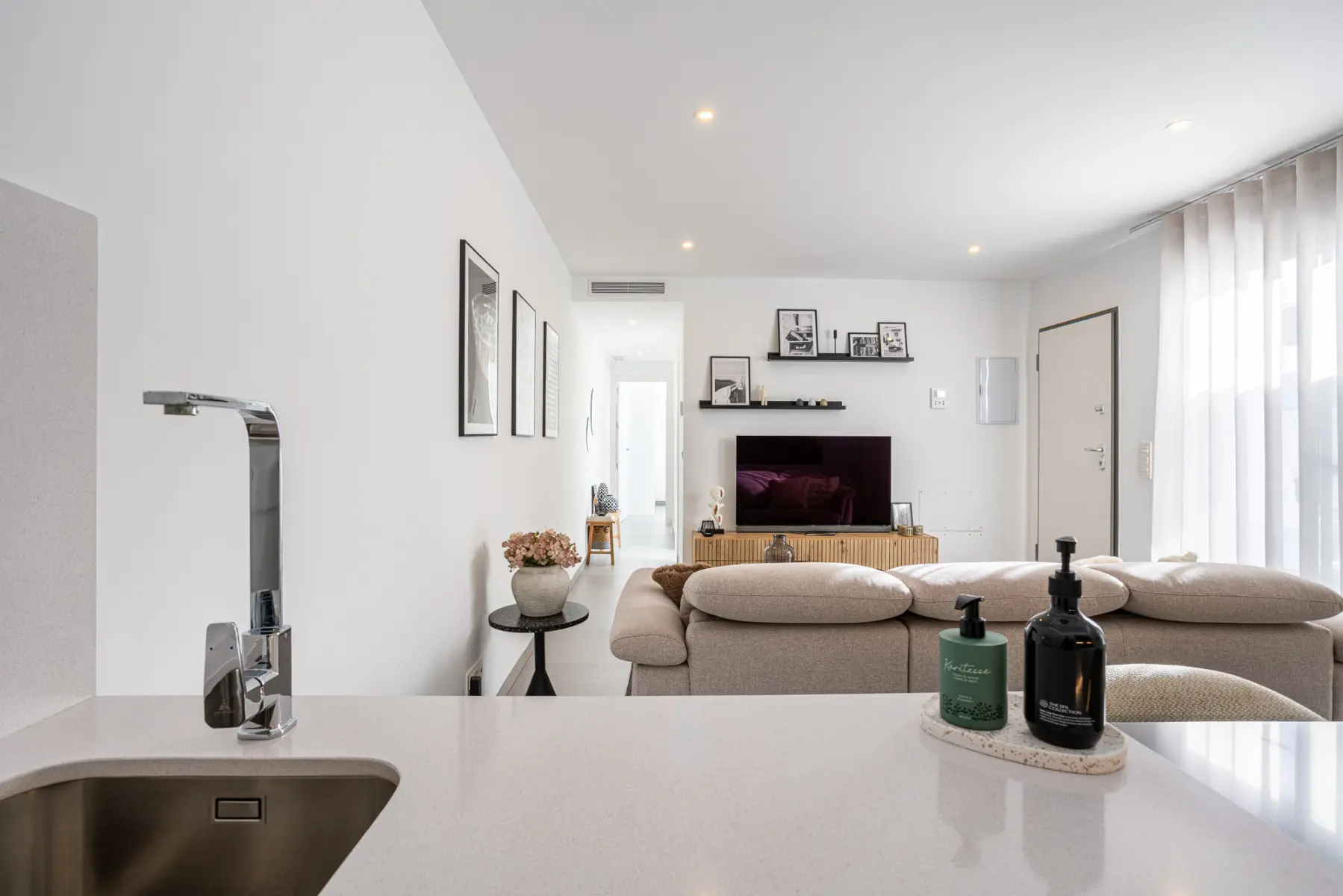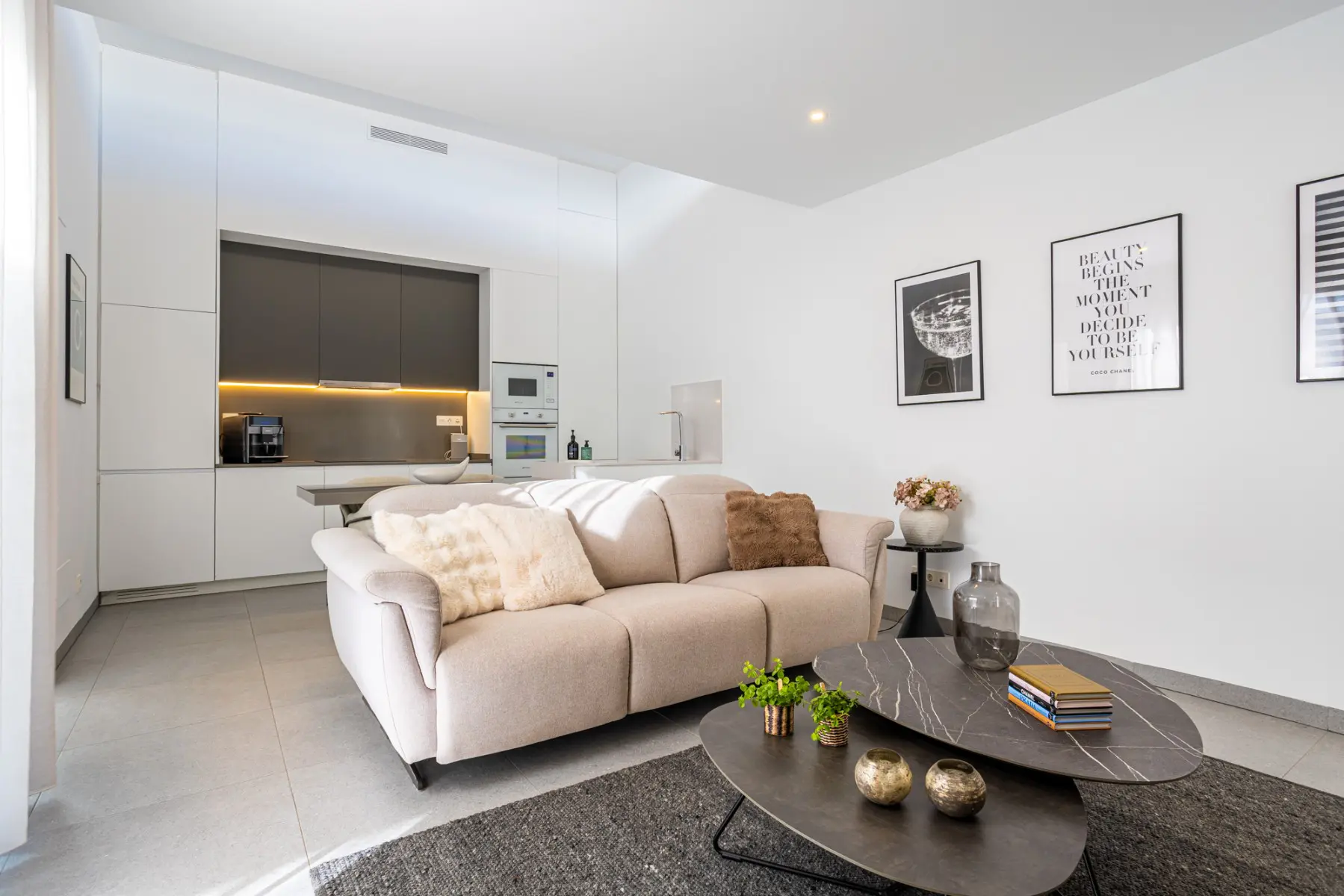 Inside, the home features three spacious bedrooms, all with built-in wardrobes, and two modern bathrooms, one of which is ensuite to the master bedroom. There is also a laundry and extra wardrobe area, very useful yet discreet. The open-plan kitchen flows seamlessly into the living and dining area, creating a welcoming and functional space ideal for both everyday living and entertaining guests. The property is in excellent condition, ready to move into, and is sold fully furnished, including appliances and air conditioning for year-round comfort.