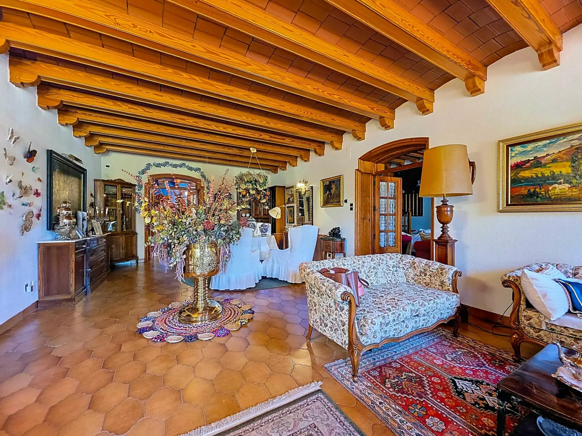 Most of the ground floor has interconnected living and dining rooms, flowing beautifully and accessible from both the main entrance and the patio. One room features its own elevated bar area—perfect for entertaining. A separate wing houses three bedrooms and two bathrooms, with one room transformed into an office complete with a library. A staircase leads to the upper level, where more space awaits.