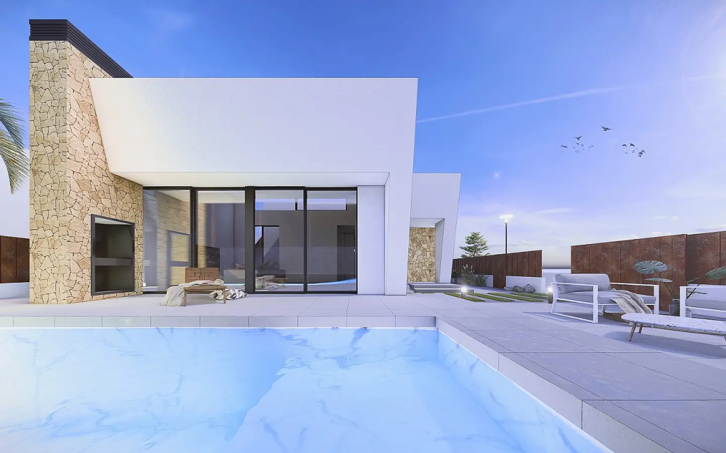 MonteVista Lux Villas presents new design options featuring one-level villas with generous plot sizes. These properties are located in a residential area beside a park in San Pedro del Pinatar.
