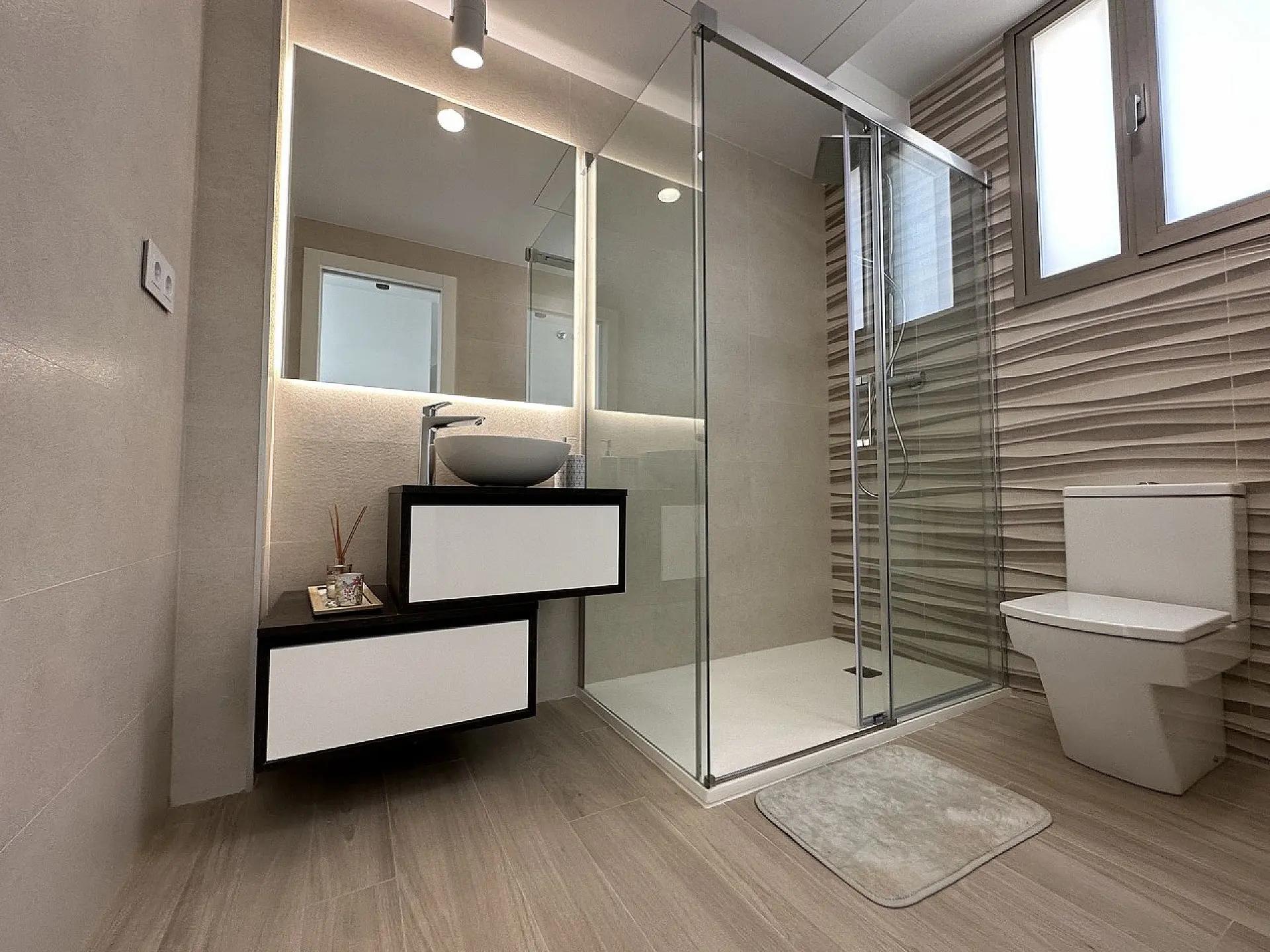 Each Sunset Beach Lux Villa is a brand new, key-ready property. A second villa is also under construction, promising further opportunity for potential buyers. These high-quality builds span three levels. The total areas include a ground floor measuring 90 square meters, a first floor at 28 square meters, plus a solarium of 55 square meters, and a basement of 160 square meters that allows for additional living space. The layout includes three double bedrooms and three bathrooms, with an open plan living area featuring a modern fitted kitchen and a breakfast bar. Large patio doors slide open to connect the indoor space with the private swimming pool and the surrounding terrace.