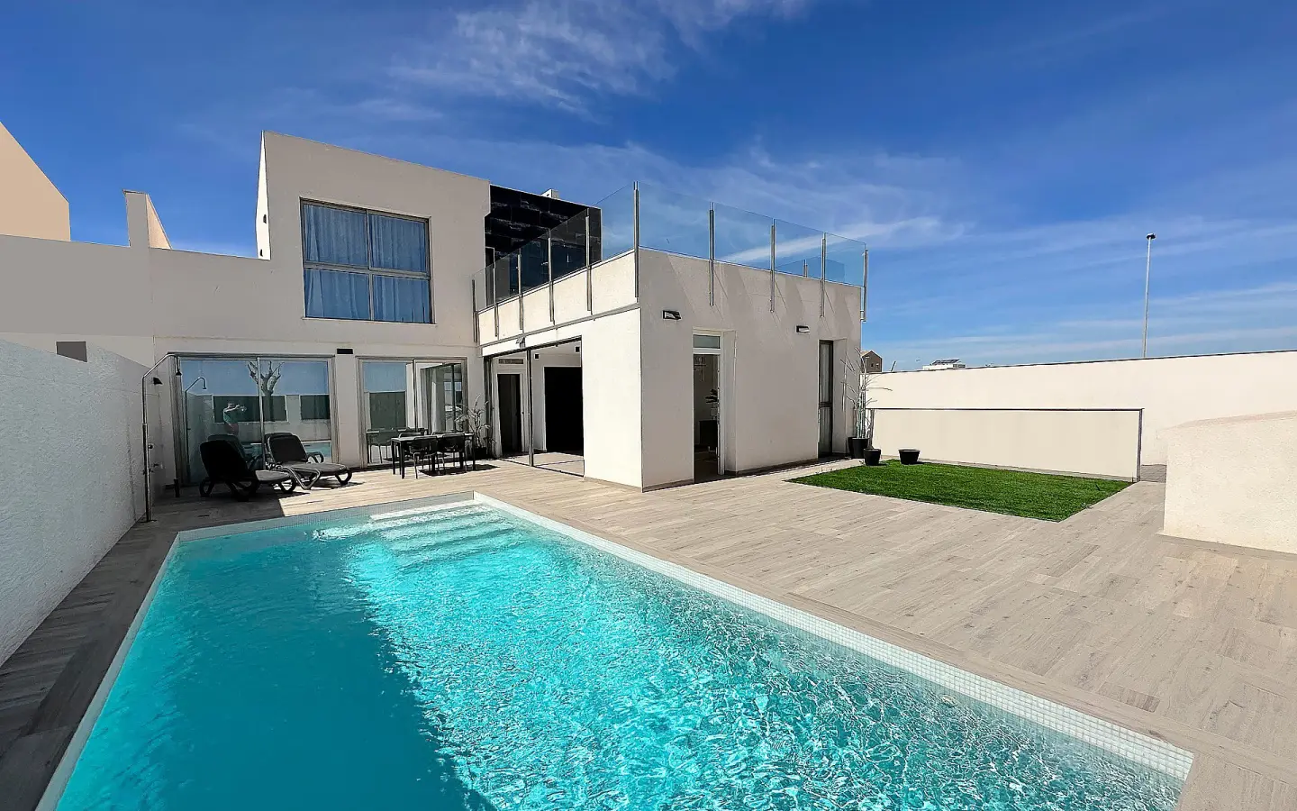 Sunset Beach Lux Villas in Los Belones, La Manga offers contemporary detached villas, with options for 2 and 3-bedroom configurations. Each unit features 3 bathrooms and a private swimming pool measuring 7×3 meters. Positioned strategically, these homes provide views of the sea and the coastline, while still being conveniently set back from the main town of Los Belones in the Murcia region.