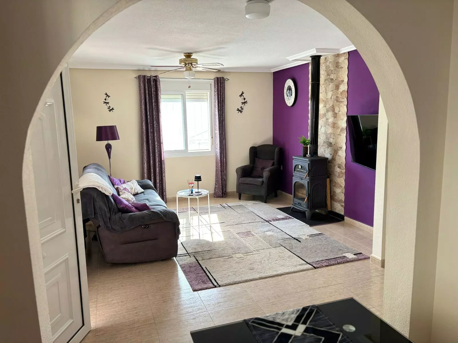 The fully equipped kitchen includes modern appliances, catering well to culinary needs. It serves as a practical workspace for cooking enthusiasts. The living/dining room is naturally lit and features a wood-burning stove, providing warmth during colder months.