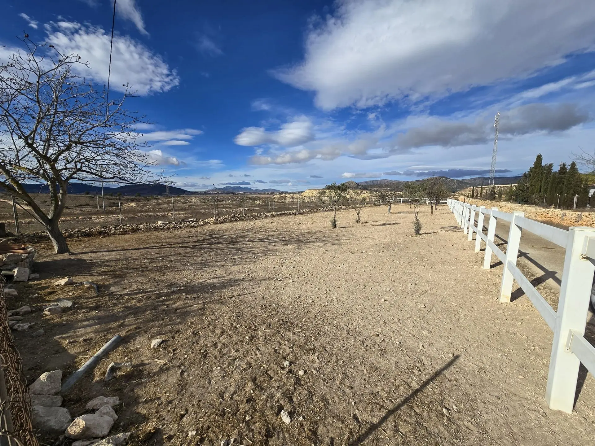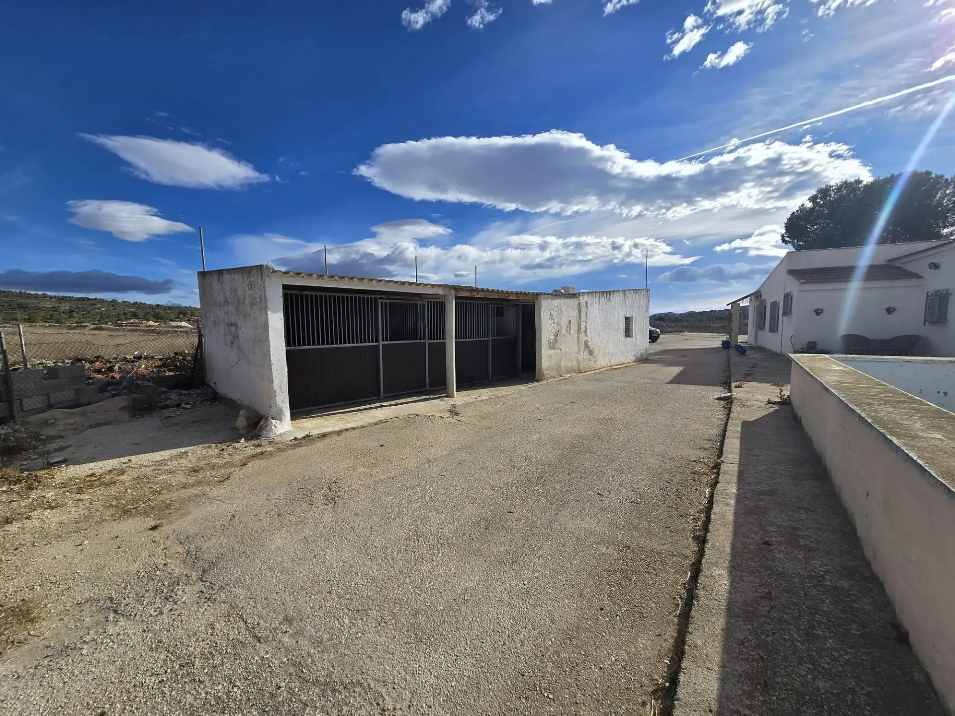 The property boasts a driveway lined with olive trees, leading to double gates. The area for the horses is securely fenced. Upon entering the main gates of the house, you will find the stables on the left side, with the house and pool located to the right. There are also two additional gates giving access to more land. The total area is approximately 11,000m2, providing ample space for equestrian activities and potentially suitable for dogs as well.