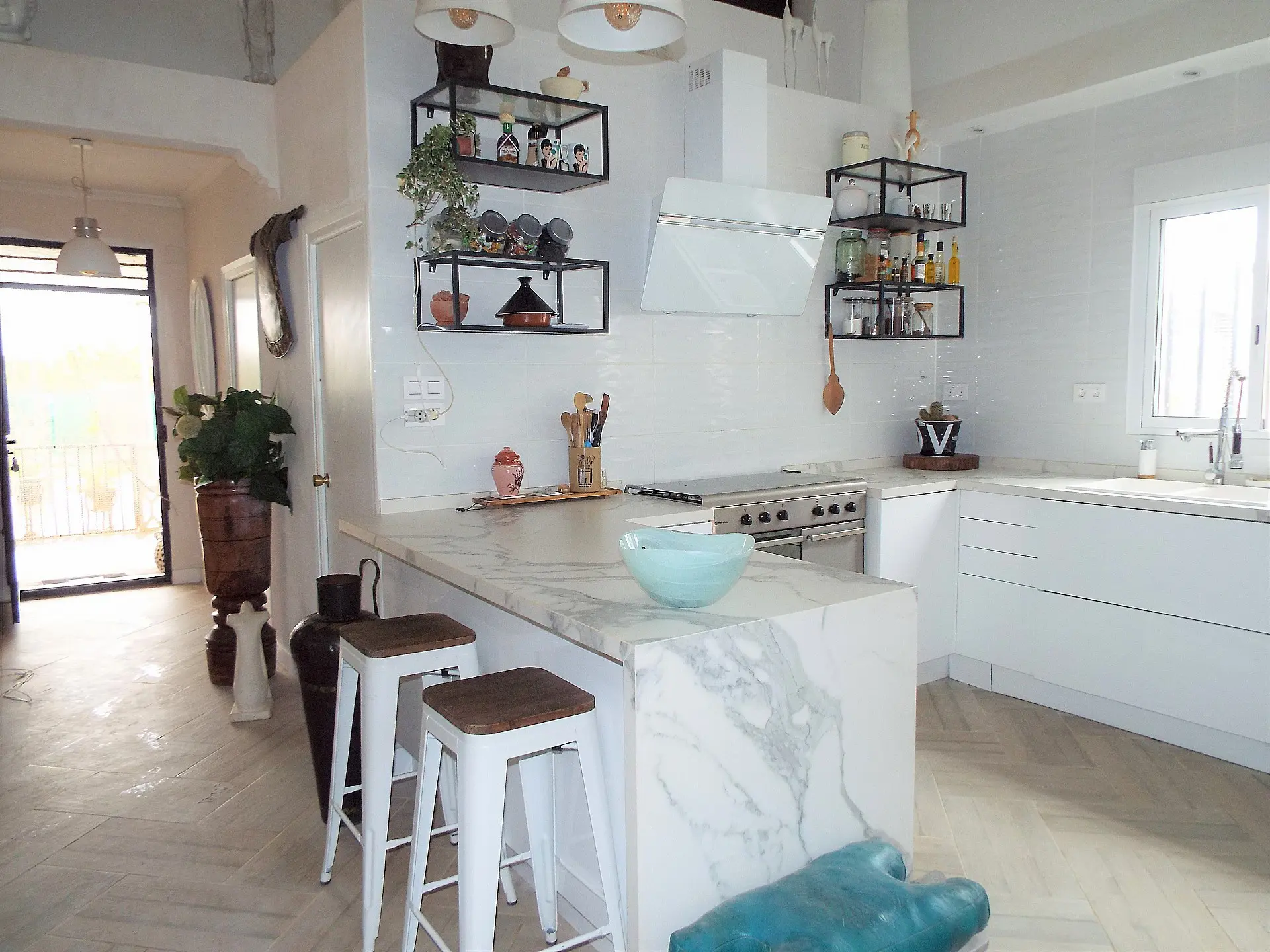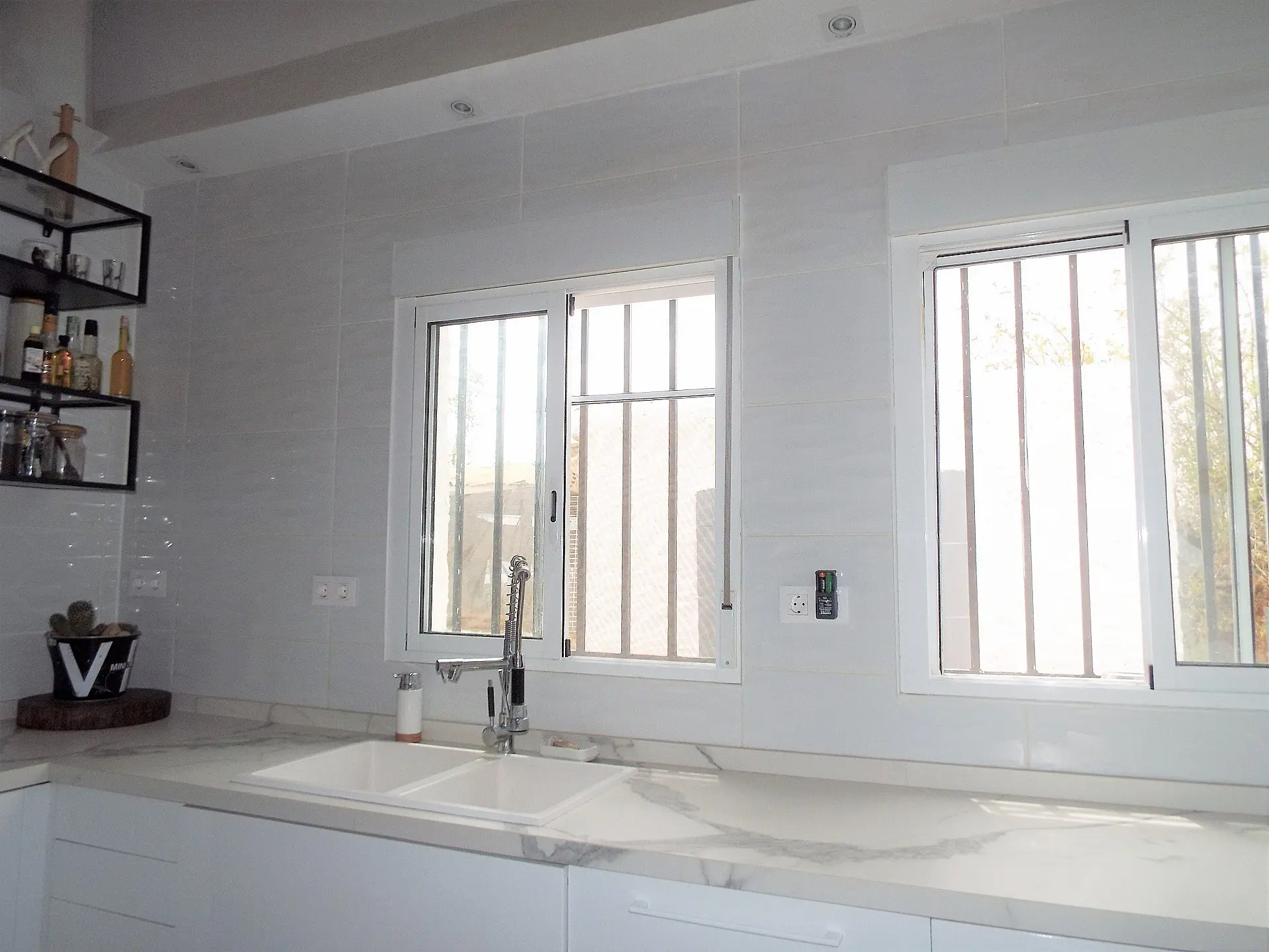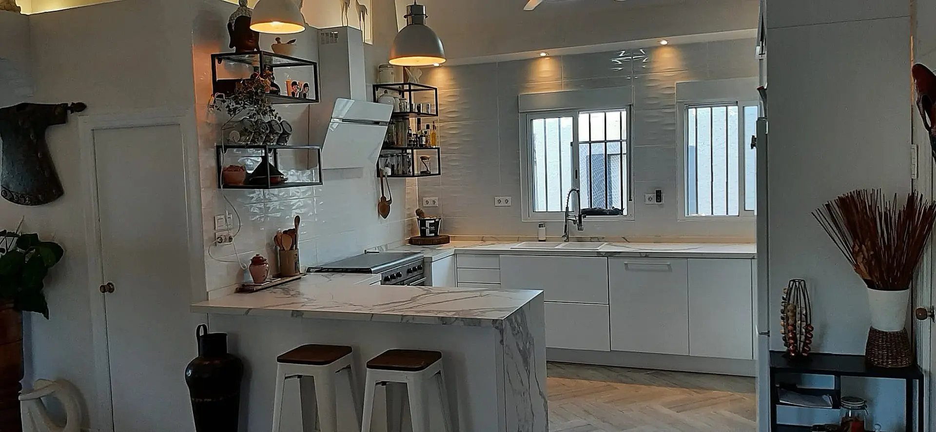 The living area features two large double bedrooms with new windows, while a third single bedroom is currently utilized as an office. There are also two bathrooms with modern designs. The first bathroom includes a walk-in shower, underfloor heating, spotlights with a color change feature, bidet, and a W/C, along with a double sink in the vanity unit and a mirror with music connectivity. The second bathroom consists of a basin, W/C, and bidet, accompanied by a storage room.