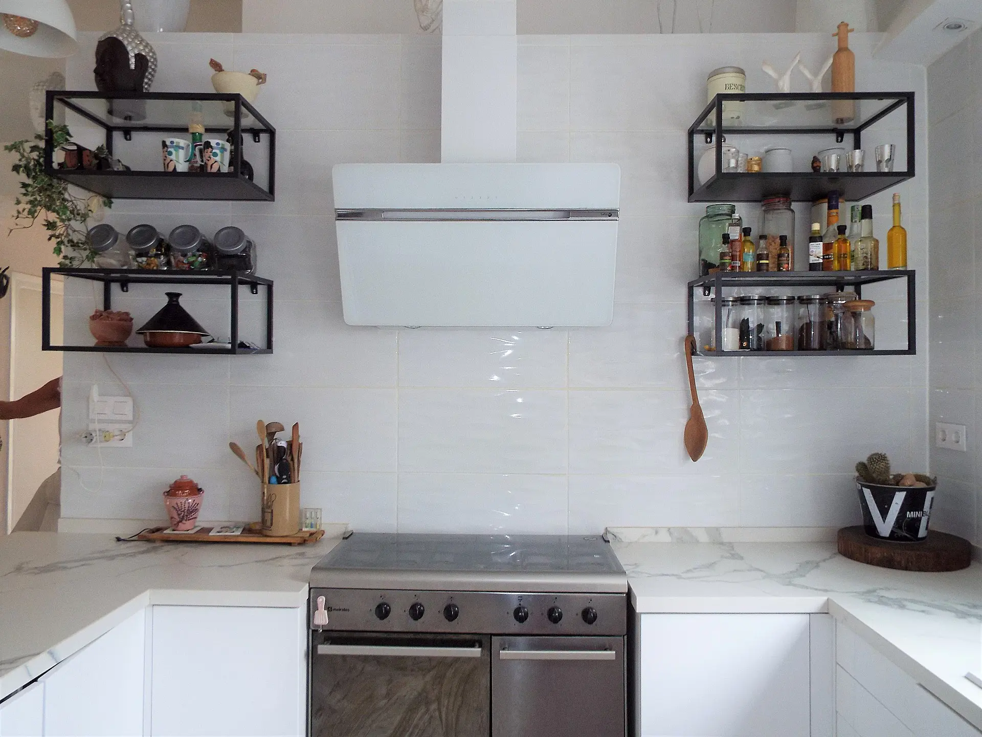 Upon entering through the terrace, you arrive at the completely remodeled living area. This space is bright and consists of an open plan fully fitted kitchen, equipped with a fridge freezer, built-in microwave oven, fitted extractor, and a double oven and hob. Equipped with fitted spotlights, the kitchen enhances usability in the evening. New double-glazed windows and a patio door lead to a side seating area, complemented by a log burner that offers sufficient heating for the entire home during winter.