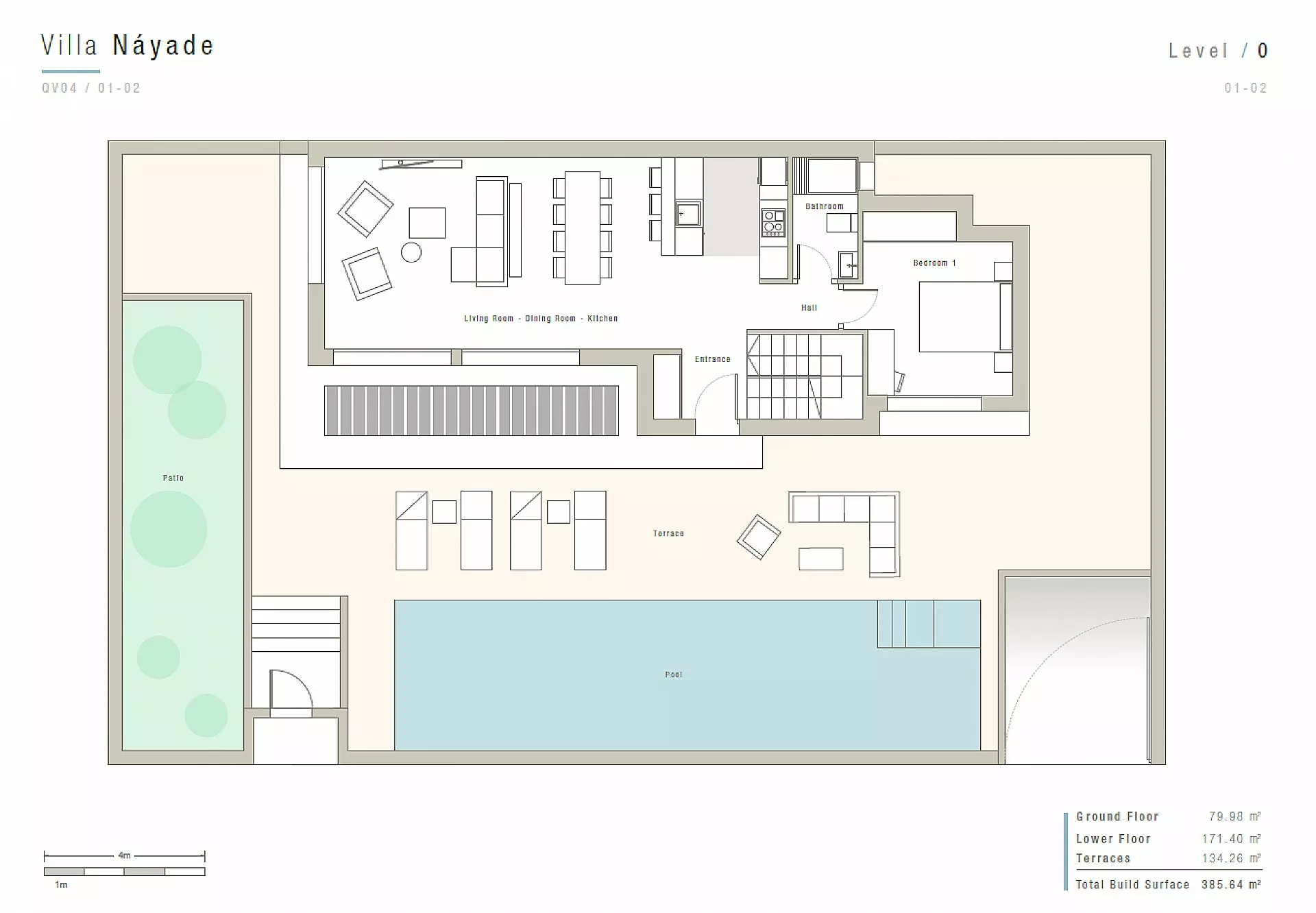 Inside, the villa showcases a neutral color palette and high-quality finishes that contribute to bright and airy interiors.