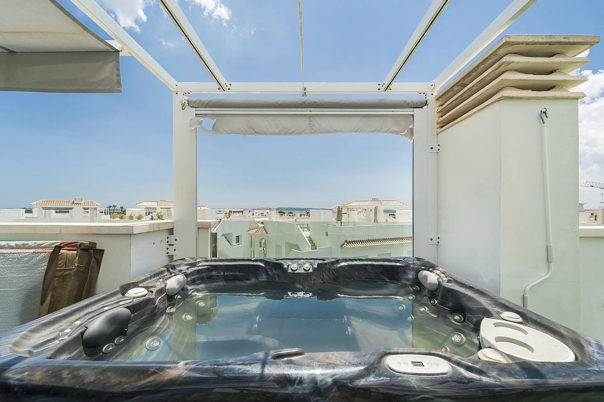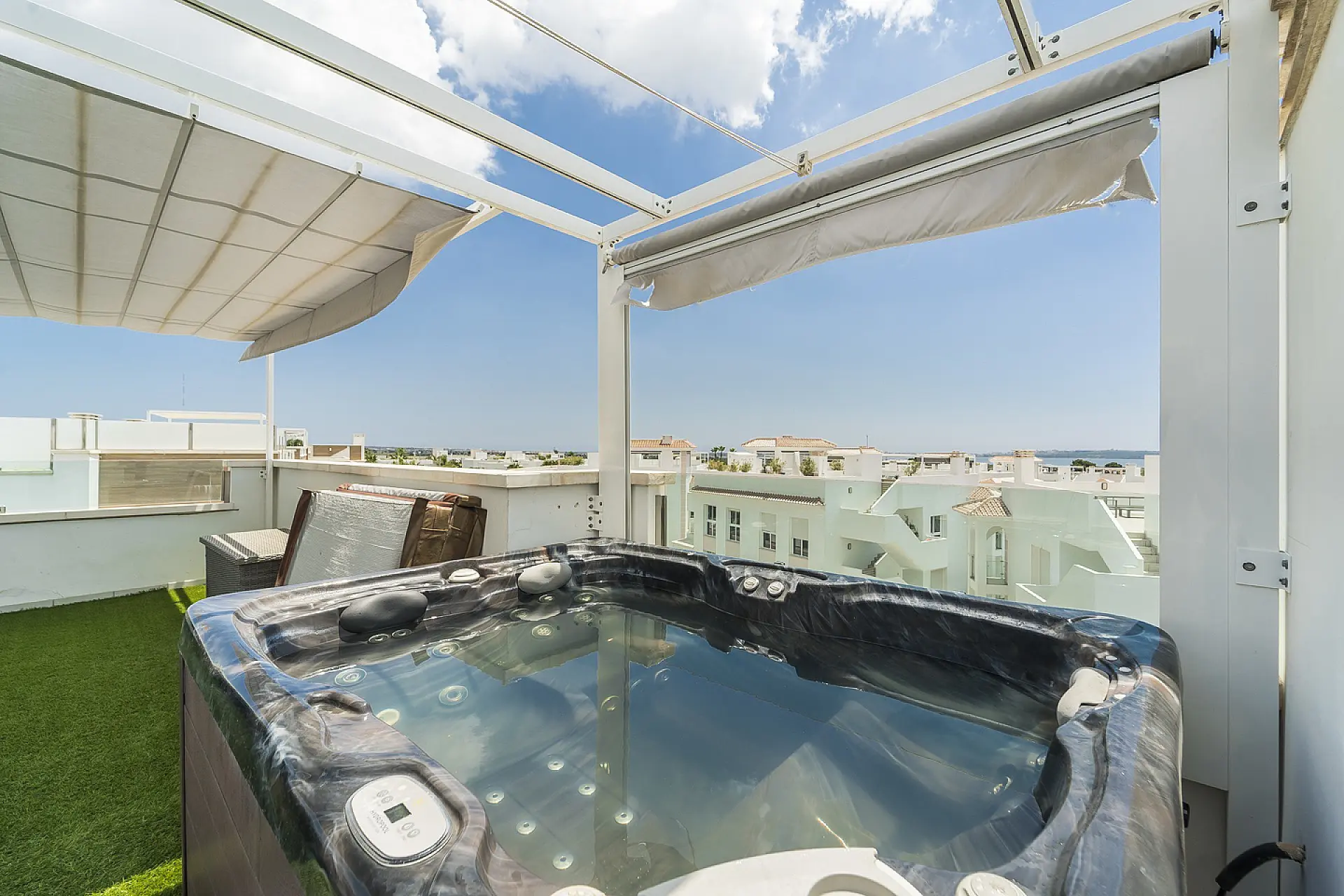 The villa includes a vast underbuild that hosts 2 generously sized bedrooms, each with its own en suite bathrooms. Moving up to the first floor, you’ll encounter an open-plan lounge and kitchen-diner area. The kitchen is modern and comes equipped with LED lighting. On the second level, there are 2 more bedrooms, one being the master bedroom which features en suite facilities and two fitted wardrobes. This bedroom also includes a large balcony for additional outdoor space. The other bedroom on this level also has a balcony and fitted wardrobes. For those seeking even more outdoor enjoyment, the top level reveals a spacious terrace complete with a jacuzzi. From here, views of the sea and lake can be appreciated.