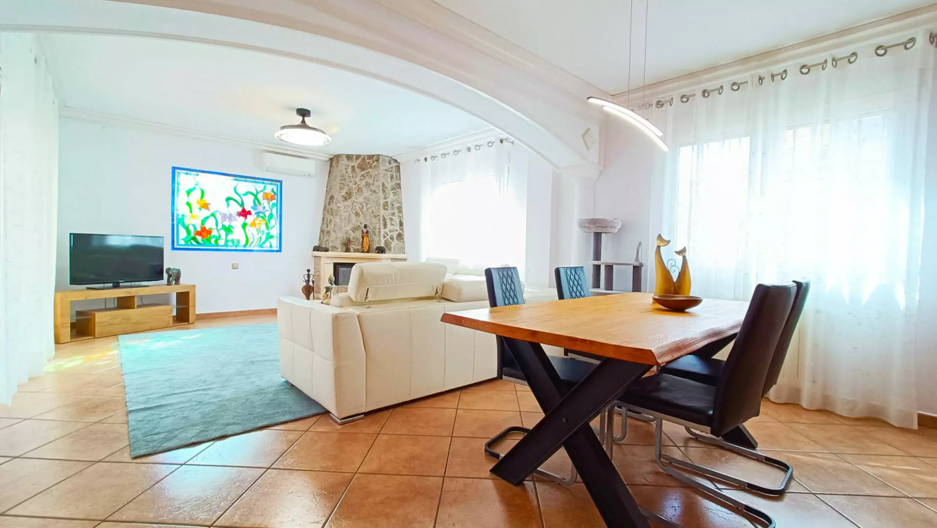 This villa sits on a 1239m² plot that includes an orchard with fruit trees and space for vegetables. The outdoor area has several notable highlights, beginning with a swimming pool that underwent renovations in 2023. It features a saltwater system, a waterfall, ambient lighting, and a roller cover for convenience.