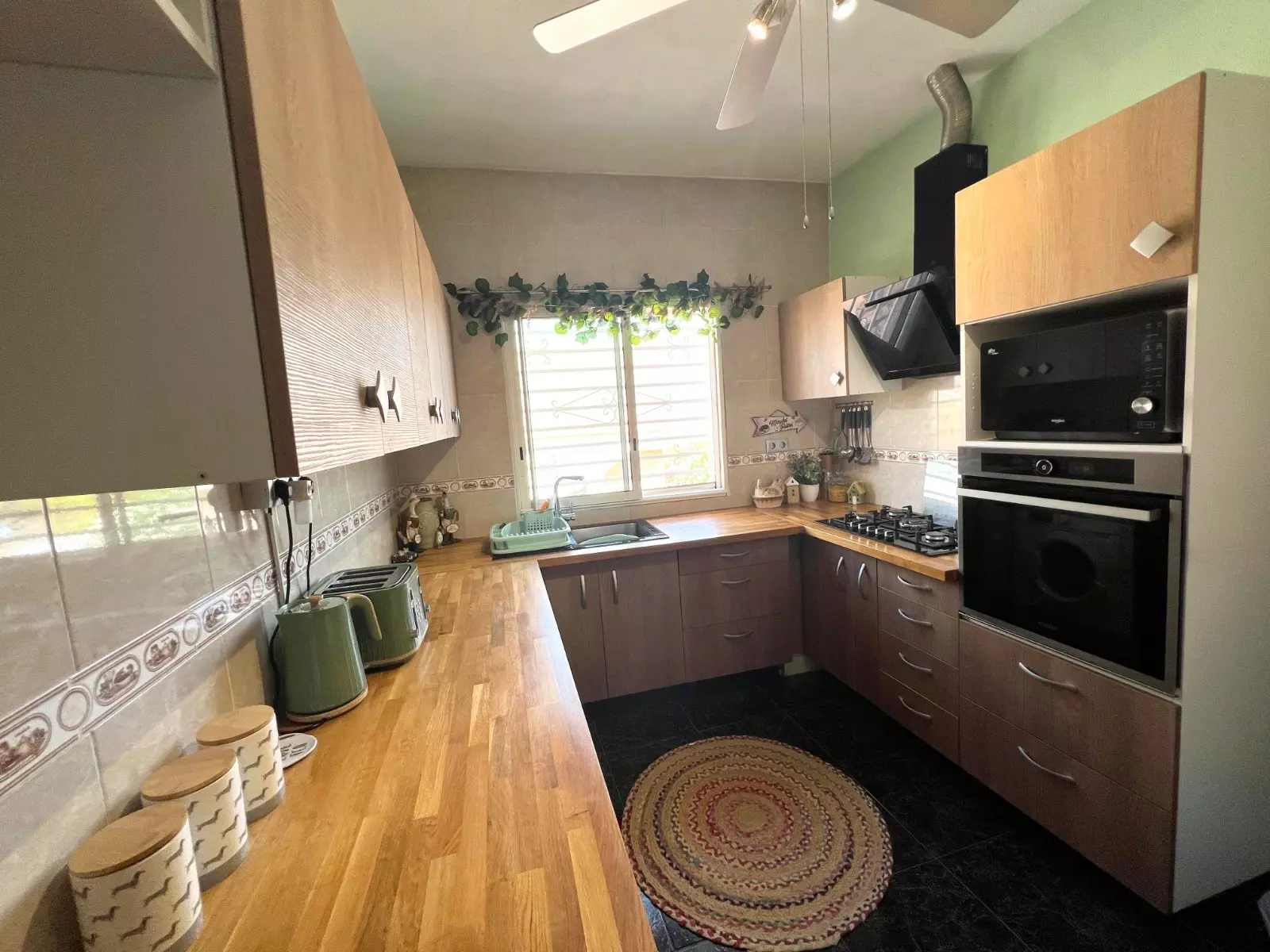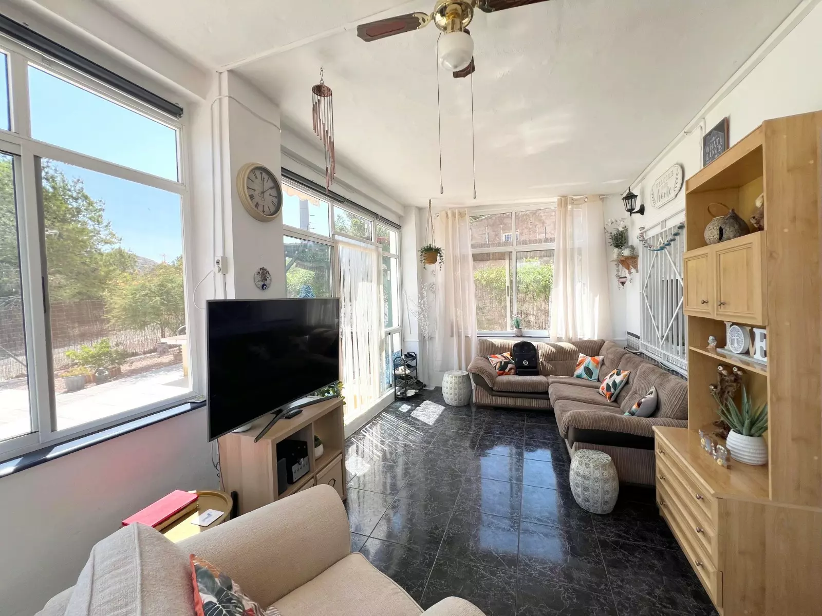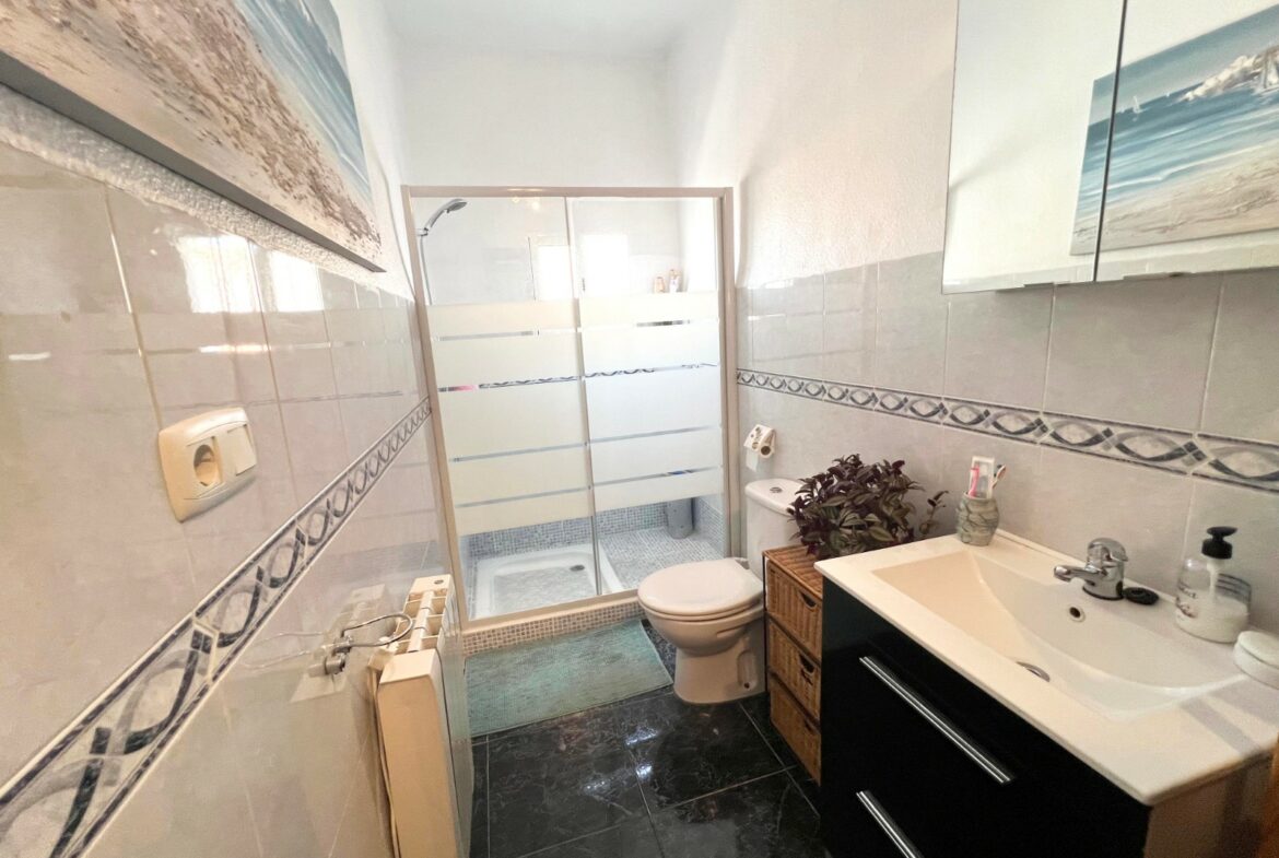 The exterior of the villa is a true oasis. Set on a fully fenced plot, this space is secure and easy to maintain. Imagine being surrounded by mature gardens with palm trees and a variety of outdoor plants. A brand-new terrace enables sunbathing, while the private swimming pool—complete with an outdoor shower—invites relaxation on warm Mediterranean days.
