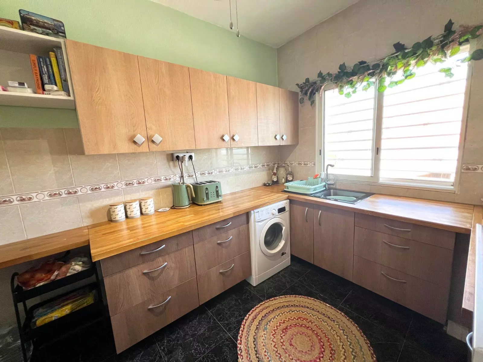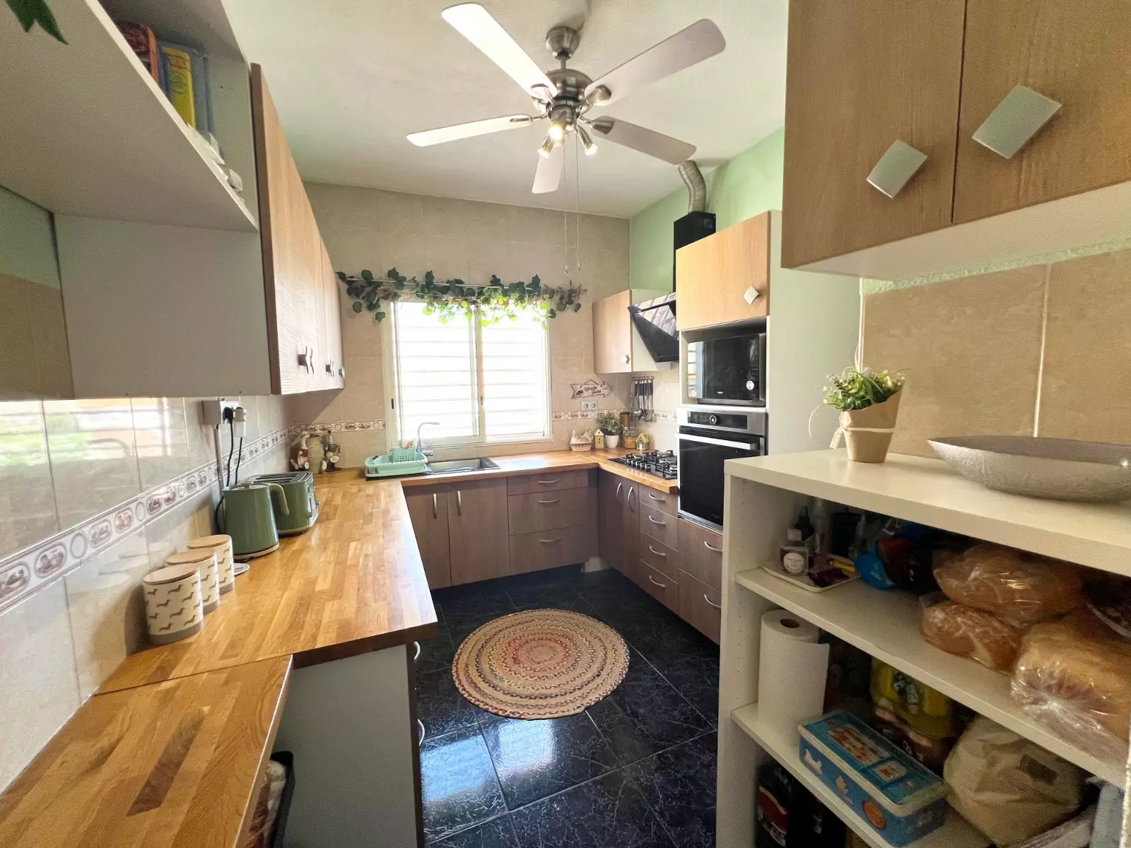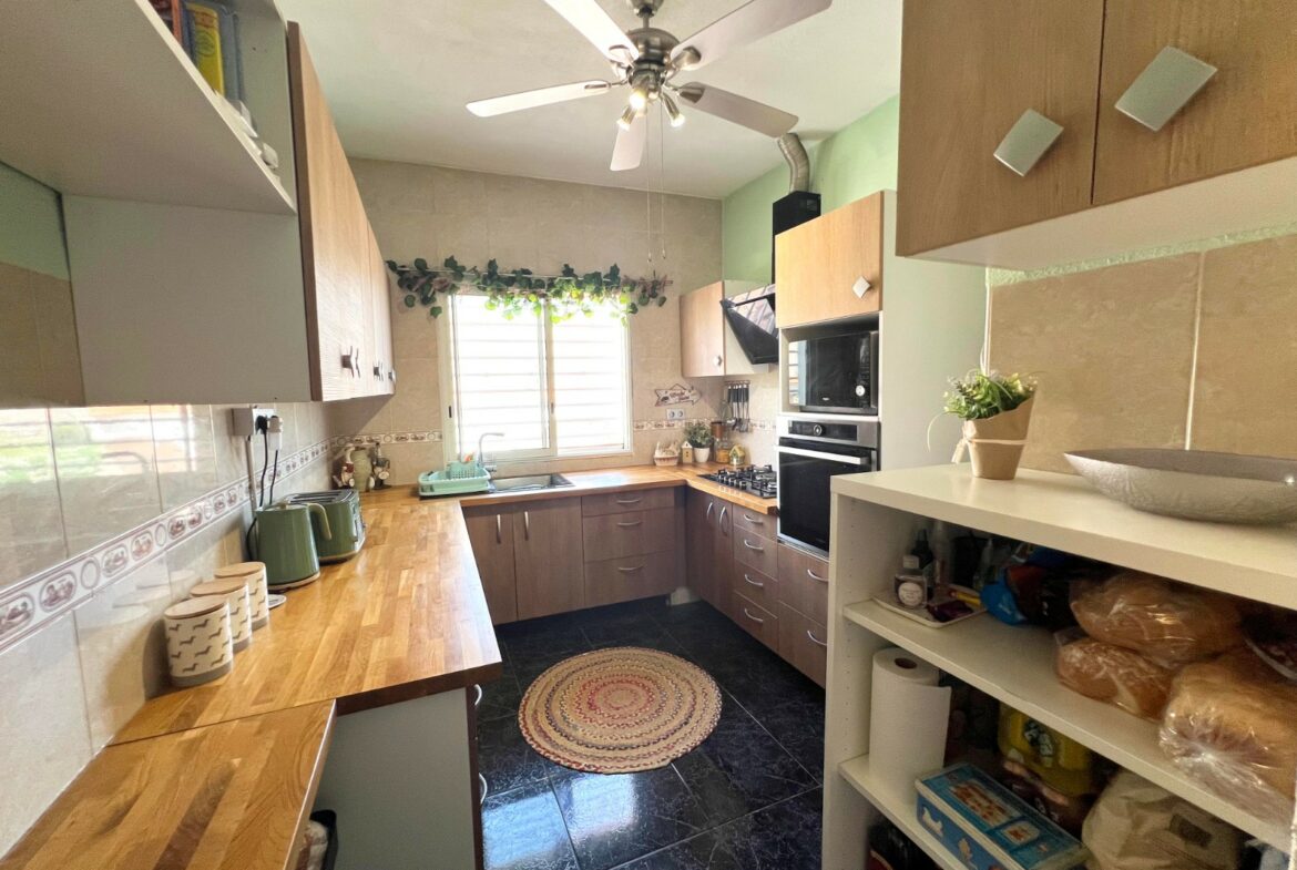 The exterior of the villa is a true oasis. Set on a fully fenced plot, this space is secure and easy to maintain. Imagine being surrounded by mature gardens with palm trees and a variety of outdoor plants. A brand-new terrace enables sunbathing, while the private swimming pool—complete with an outdoor shower—invites relaxation on warm Mediterranean days.