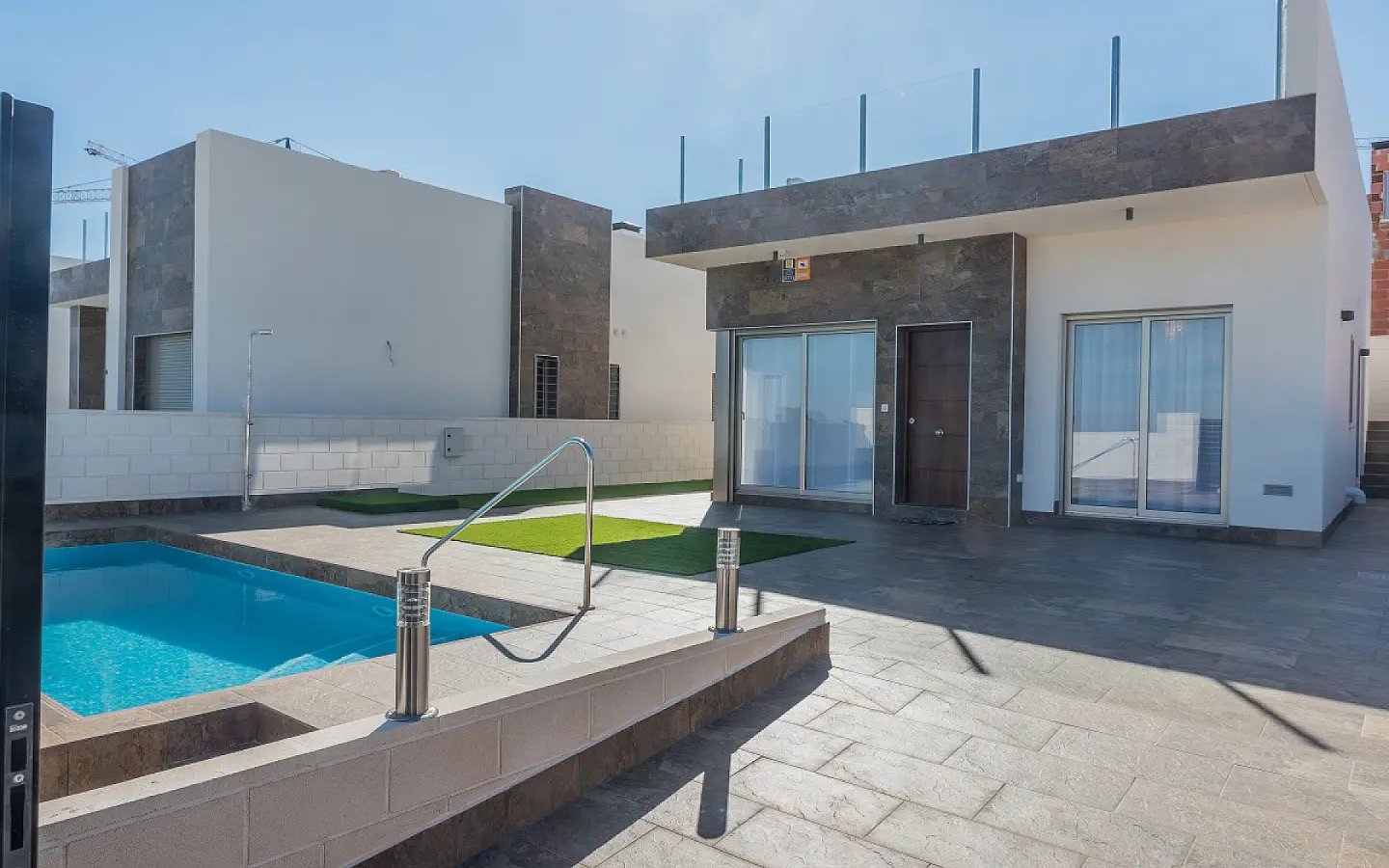 The villas feature an open-plan living and dining area that seamlessly connects to the front garden, which includes one parking space and the private swimming pool. The master bedroom provides direct access to this garden. It is fitted with wardrobes and includes an en-suite shower room, complete with a shower enclosure, W/C, and a fitted vanity sink unit. The other two bedrooms also come with fitted wardrobes, ensuring ample storage space.