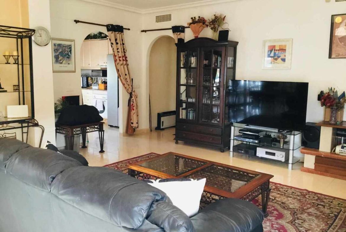As you step through the front door, you’re greeted by a large living room that’s designed for comfort and leisure. It’s bathed in natural light, thanks to patio doors on either side that open to the sun balcony. On one side, you can gaze out at the driveway with its electric gates and garage entrance, while the other side offers a serene view of the swimming pool and vibrant gardens. This is truly a place to unwind.