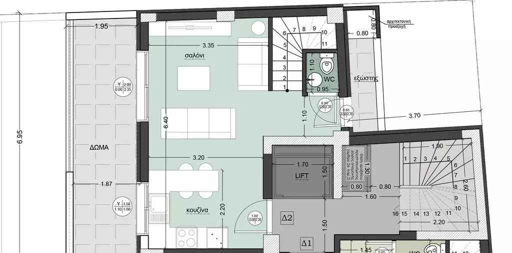 This duplex spans the 6th and 7th floors. The layout features a living room combined with a kitchen on the 6th floor, offering an open design suitable for various arrangements. Additionally, this floor includes a WC for guest convenience.