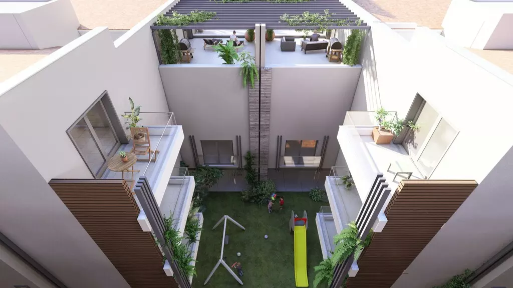 The duplex is positioned on the 2nd and 3rd floors. The 2nd floor features one bedroom, a living room that opens to the kitchen, and a shower/WC. Moving up to the 3rd floor, you’ll find another bedroom along with an additional shower/WC. This layout is designed for convenience and privacy across both levels.