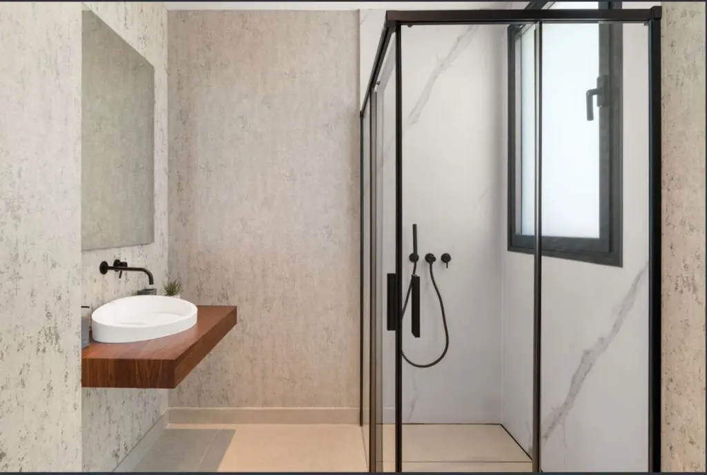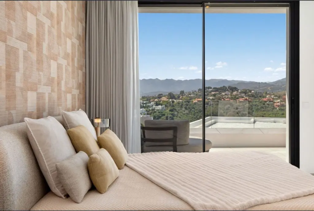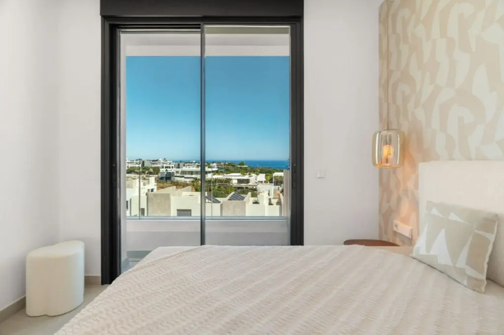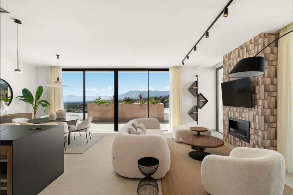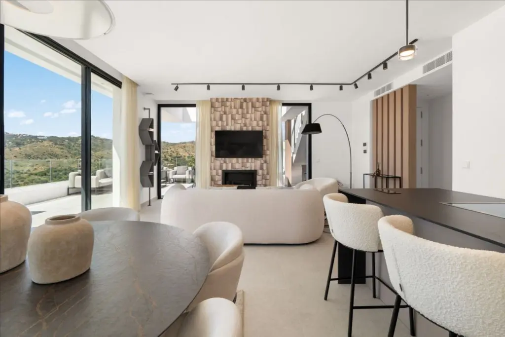 The property perfectly blends contemporary design with comfort, featuring a spacious and light-filled living room with a modern fireplace and direct access to the main terrace. The open-plan kitchen is fully equipped with premium Gaggenau appliances, a breakfast bar, and a built-in wine fridge. The master bedroom offers sea views and an en-suite bathroom, while the two guest bedrooms also benefit from private bathrooms, complemented by an additional guest toilet.
