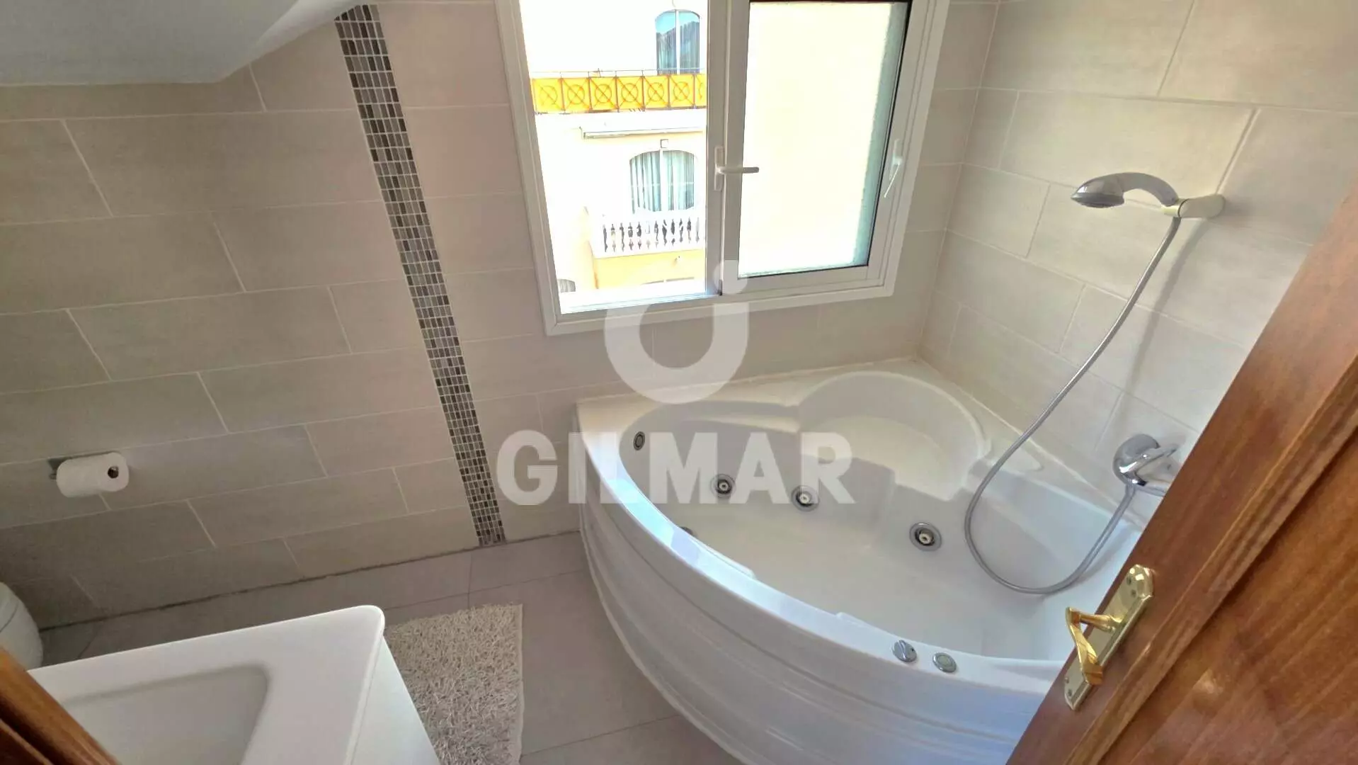 The property, located on the top floor, has 106 m² built, distributed over two levels. The main floor features a bright living-dining area with a 6 m² enclosed terrace, a recently refurbished open-plan kitchen, one double bedroom and a bathroom with shower. The upper floor offers a second double bedroom with fitted wardrobes, a bathroom with hydromassage bathtub and a spacious 21 m² private terrace.