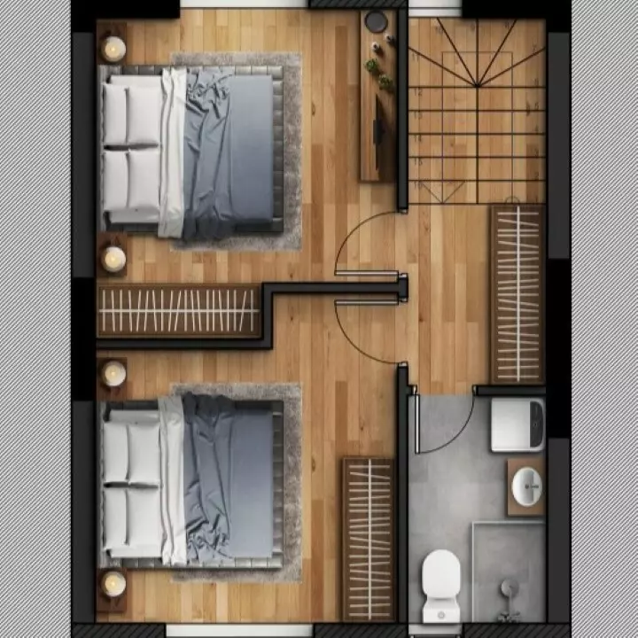 The first floor features one bedroom, a living room area combined with a kitchen, and a WC for convenience. Moving to the second floor, you will find two additional bedrooms and a shower WC. This layout is functional for families or groups seeking ample space.