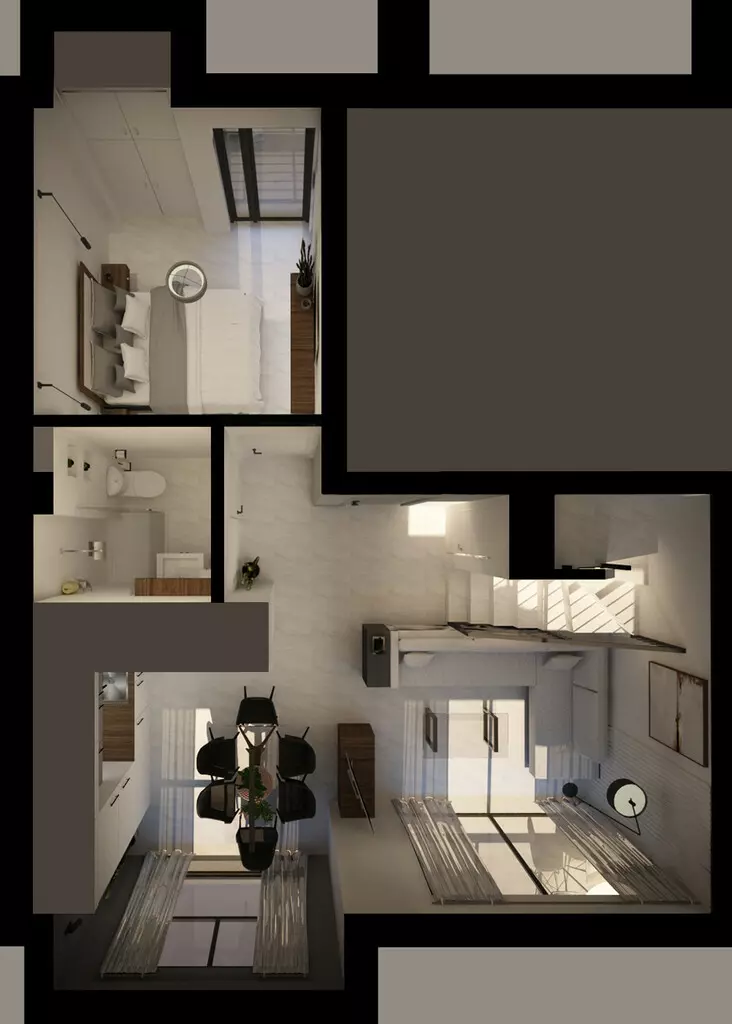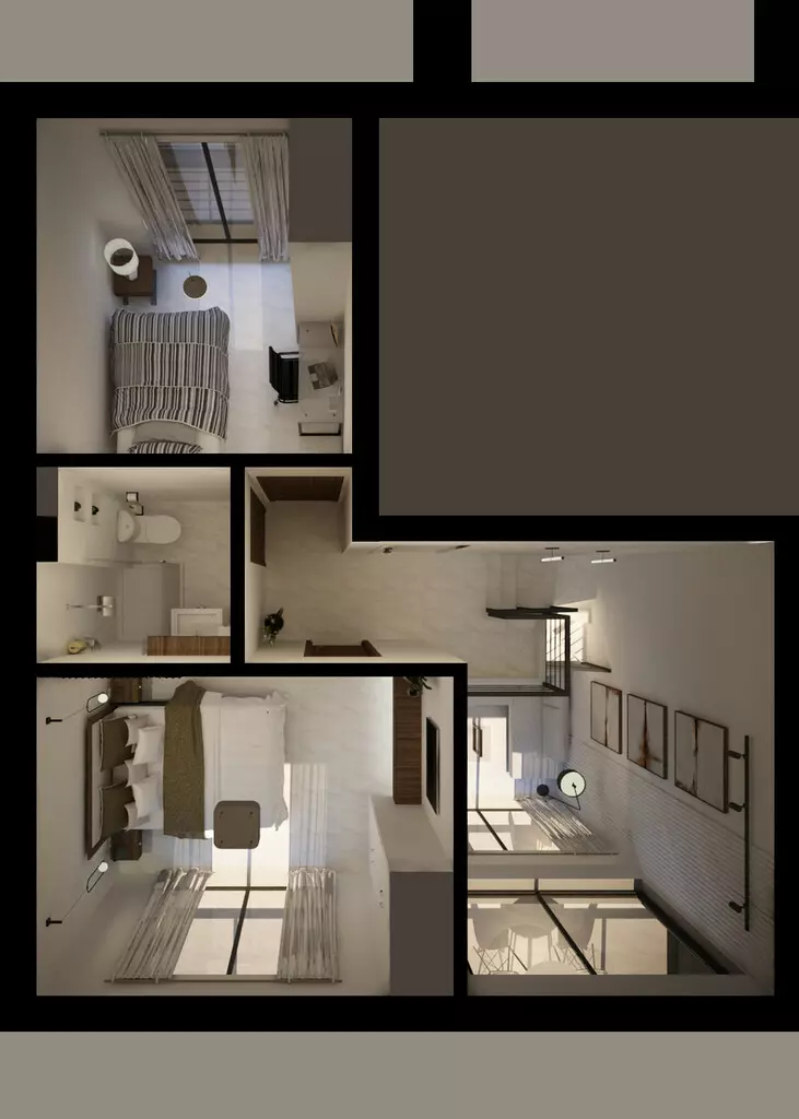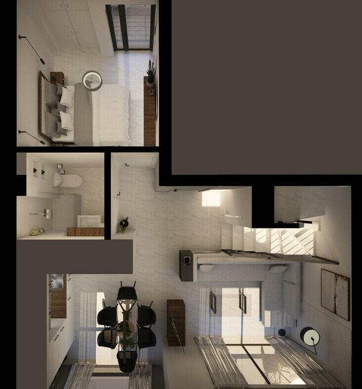 The 5th floor features one bedroom along with a living room that integrates a kitchen. There’s also a shower WC on this level. Moving up to the 6th floor, you will find two additional bedrooms and a second shower WC. This arrangement makes it a practical option for families or roommates.