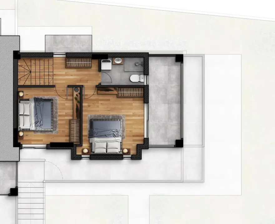 The first floor comprises one bedroom, a living room combined with a kitchen, and a WC. The second floor is designed with two additional bedrooms and a shower with a WC, enhancing the functional layout of this duplex. Large windows provide a view of the city, allowing natural light to stream into the rooms.