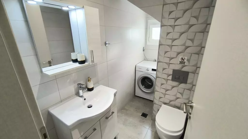 The first floor features a bedroom, a living room combined with a kitchen, and a WC. This level is designed for efficiency and easy mobility. On the second floor, you will find two additional bedrooms along with a shower WC, offering more privacy and space for family or guests.
