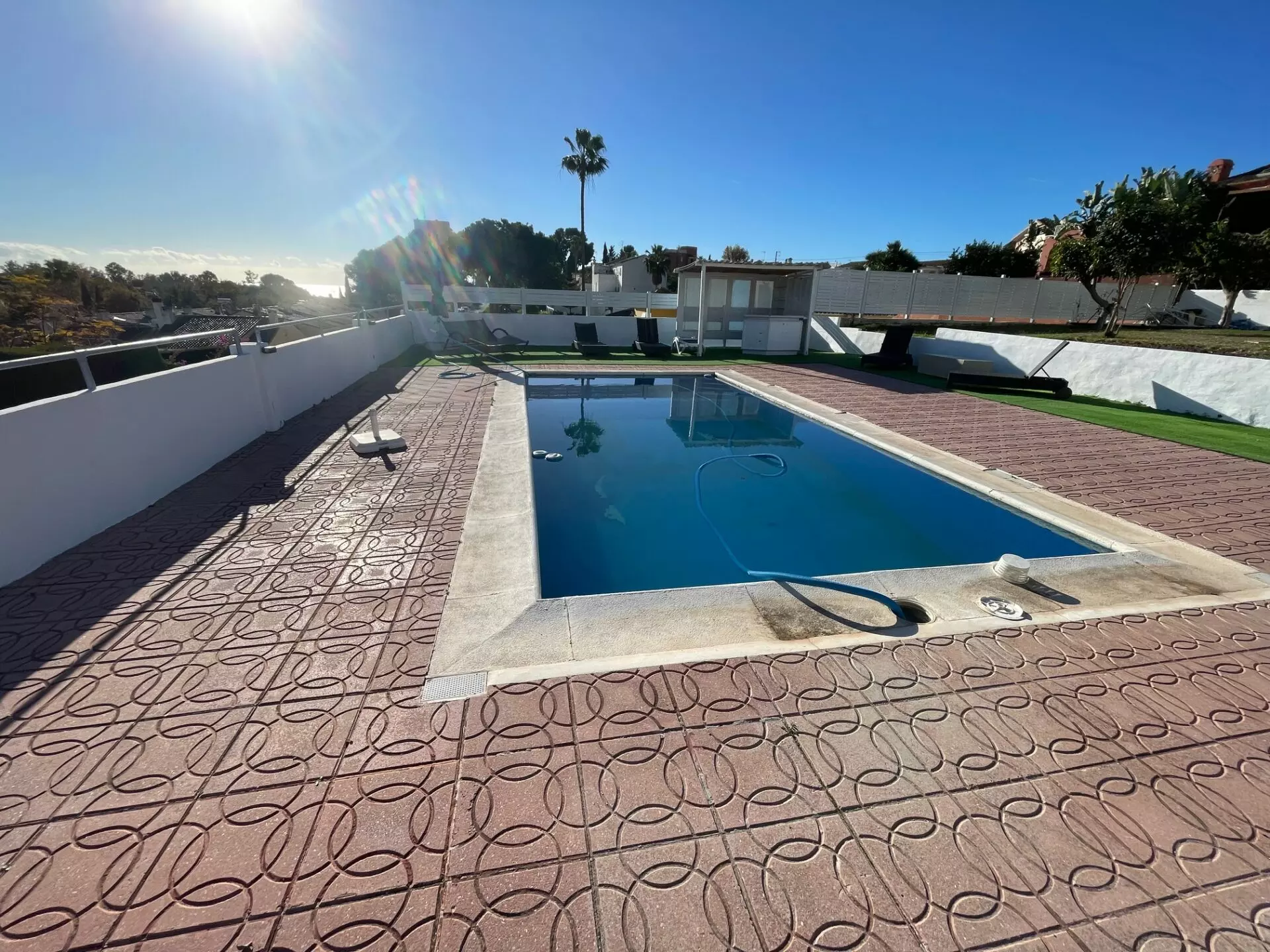HOUSE with POOL and sea views. Magnificent individual house separated by its perimeter walls of good height for privacy. The plot has a total of 935 square meters, with boundaries and walls totaling 941 square meters. In addition, the house has a large pool measuring 33 square meters. There is a storage room for pool motors and tools, etc., as well as another covered garage or warehouse, which has good ventilation and light. The house is distributed over two floors. The first floor has 3 bedrooms, a full bathroom, a complete kitchen, a living room with a fireplace, and a porch or terrace of about 12 square meters. On the upper floor, there is 1 bedroom, with a complete ensuite bathroom, and two terraces totaling 36 square meters. The entire perimeter wall has been renovated in recent years. The constructed area of the plot totals 238 square meters and provides a large area of land for grass, trees, or small seasonal plantings for those who enjoy gardening.